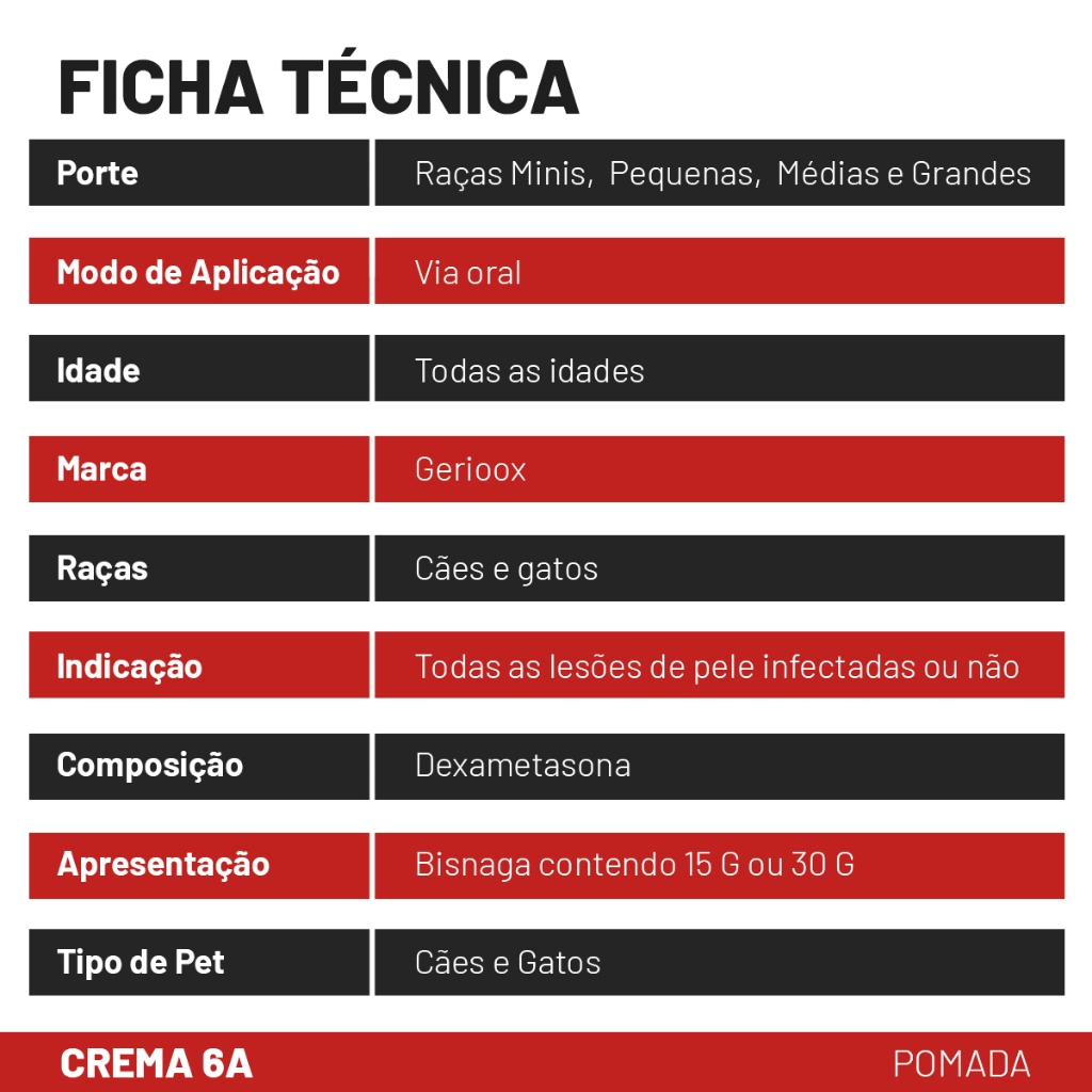 A LeluPets nasceu de uma paixão e dedicação de aproximadamente 20 anos de experiência nessa área tão incrível. Desde o início de nossa história, já são mais de 100 mil clientes atendidos. Estamos aqui determinados em fazer a diferença, democratizando e simplificando o cuidado com o seu pet para oferecer a melhor experiência para você e seu amiguinho. Mantemos nossas orelhas em pé, atentos às novidades do mundo pet para trazê-las até você. Nós somos apaixonados por pets! O seu pet é também da nossa família! Crema 6A Labyes 30g Pomada Dermatológica para Otites Todo tutor sabe o quanto cuidar de um animalzinho requer responsabilidade. Até porque, esses bichinhos estão sempre em movimento e acidentes podem acontecer. Pensando em tratar lesões de pele em peludos, a Labyes criou o Crema 6A! Não é à toa que esse medicamento para cachorro e gato é um dos mais indicados por médico-veterinários. - Indicada para cães e gatos; - Trata lesões de pele infectadas ou não; - Auxilia no tratamento de otite aguda ou crônica; - Tem ação antibiótica, anti-inflamatória, anestésica, antimicótica, antialérgica e antipruriginosa, - Hidrata a pele durante o tratamento; - Possui princípio ativo que age rapidamente sobre a lesão, - Contribui para a cicatrização estética das feridas. - Atente-se à Crema 6A bula e/ou informações da embalagem; - Consulte um médico veterinário de sua confiança para o uso apropriado deste produto; - Disponível em bisnaga de 30 g.