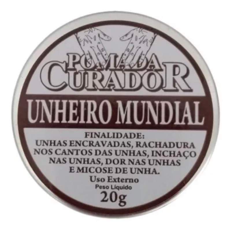 1 UNIDADE de POMADA CURADOR UNHEIRO MUNDIAL Pomada indicada para, unhas encravadas, rachadura nos cantos das unhas, inchaço nas unhas, dor nas unhas e micose de unha. COMPOSIÇÃO: Óleo vegetal, Óleo de cravo e vaselina sólida. PESO: 20g