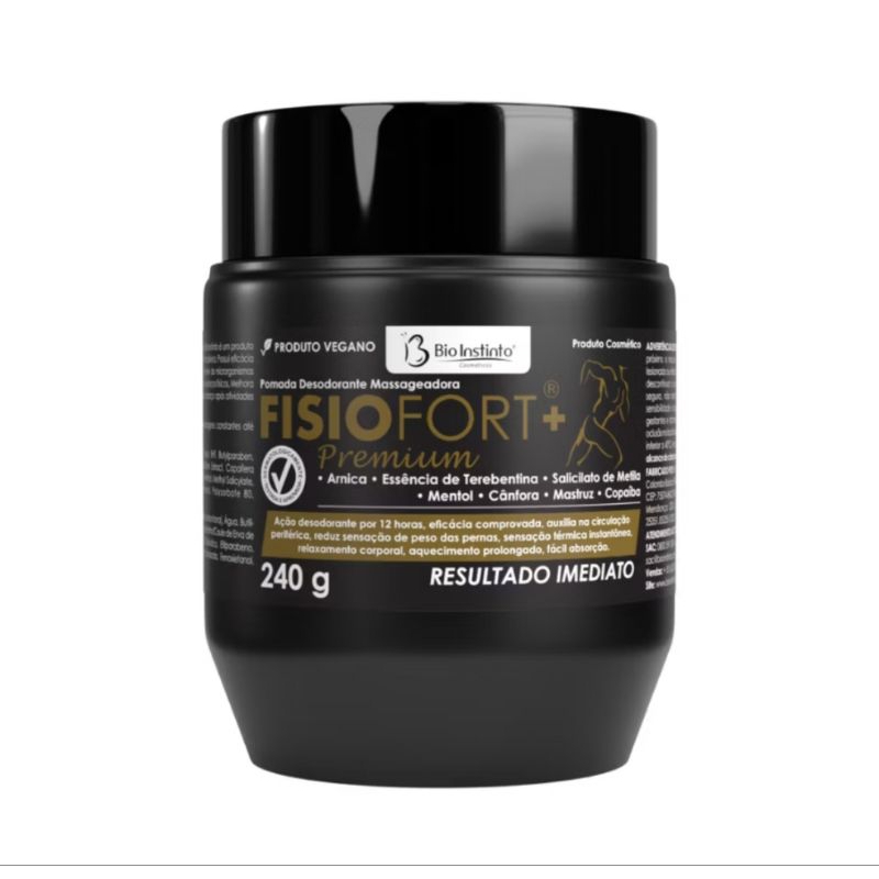 Seu pedido contém 12 Unidades de Pomadas Fisiofort+ Premium 240 G em (Pote) Envio imediato Gel FisioFort Premium Pomada Massageadora Fisiofort +Premium Bio Instinto possui fórmula nova, 0% Parabenos e 0% Petrolatum. É um produto cosmético elaborado com extratos vegetais típicos da flora brasileira. Sua função é promover relaxamento corporal e auxiliar no alívio da sensação de cansaço corporal após exercícios físicos, má postura ou esforço exagerado. MODO DE USO : Aplicar sobre a pele com auxílio de massagens constantes até completa absorção. Não enxágue.