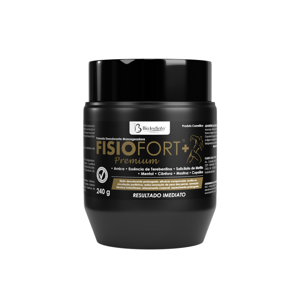 Pomada Massageadora Fisiofort Premium - Bio Instinto - Feito com extratos vegetais da flora brasileira. - Proporciona efeito desodorante prolongado. - Reduz a sensação de peso nas pernas. - Sensação térmica instantânea. - Dermatologicamente testado e aprovado.