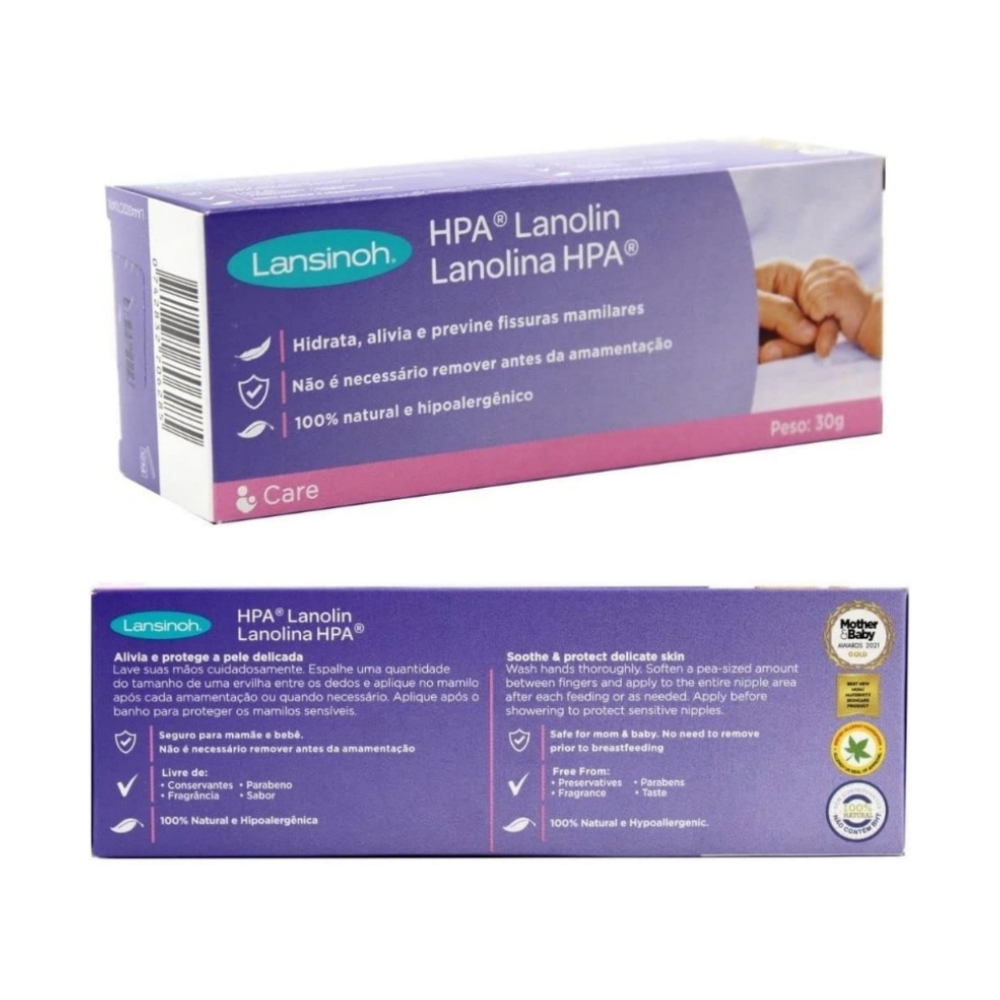 Pomada de Lanolina HPA® Lansinoh – 30g 100% natural. Acalma e protege os mamilos doloridos e fissurados durante a amamentação. Não necessita retirar antes de amamentar, aconselhável aplicar antes e depois da amamentação ou quantas vezes sentir necessidade. Ultrapura pode ser usada a partir do sétimo mês de gestação e tem propriedades que Hidratam, Aliviam e Previnem as fissuras mamilares. Benefícios: • Hidrata, alivia e previne fissuras nos mamilos. • 100% natural e hipoalergênica. • Repõe a barreira natural da pele para acalmar e proteger mamilos doloridos. • Uso seguro para mãe e bebê durante a amamentação, sem necessidade de remoção. • Sem aditivos, conservantes, fragrâncias, sabor, cor ou cheiro. Composição: 100% Lanolina HPA Conteúdo: 30g Modo de usar: Espalhe uma quantidade equivalente a uma ervilha entre os dedos e aplique no mamilo após amamentar ou conforme necessidade. Pode ser utilizada a partir do sétimo mês de gestação.