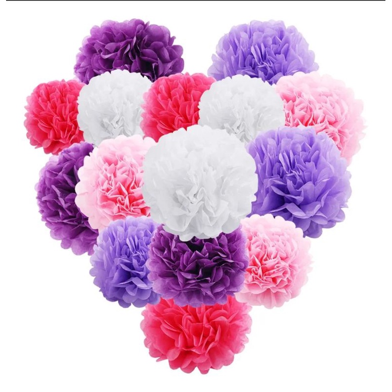 As flores pompons são feitas de papel seda com cores vibrantes, são ótimas opções para incrementar a decoração da sua festa e dar aquele toque especial. Cor: laranja, roxo, rosa pink, rosa claro, preto, vermelho, verde escuro, azul escuro, azul claro, verde claro, laranja, amarelo, branco. Comprimento: 36cm É preciso abrir a flor manualmente com cuidado para que fique volumosa.