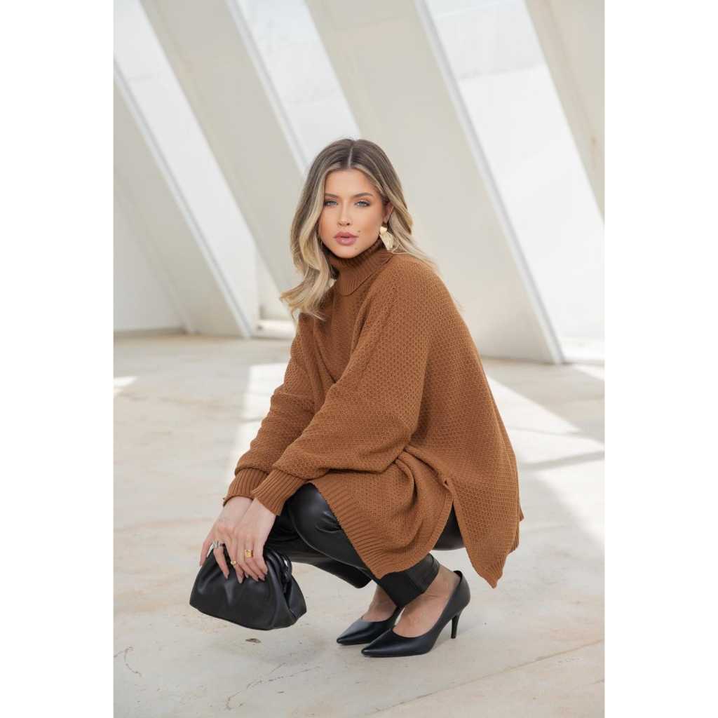Poncho Feminino de Tricot Gola Alta Fenda na Lateral Ponto Fang Tendência Moda Inverno 2025