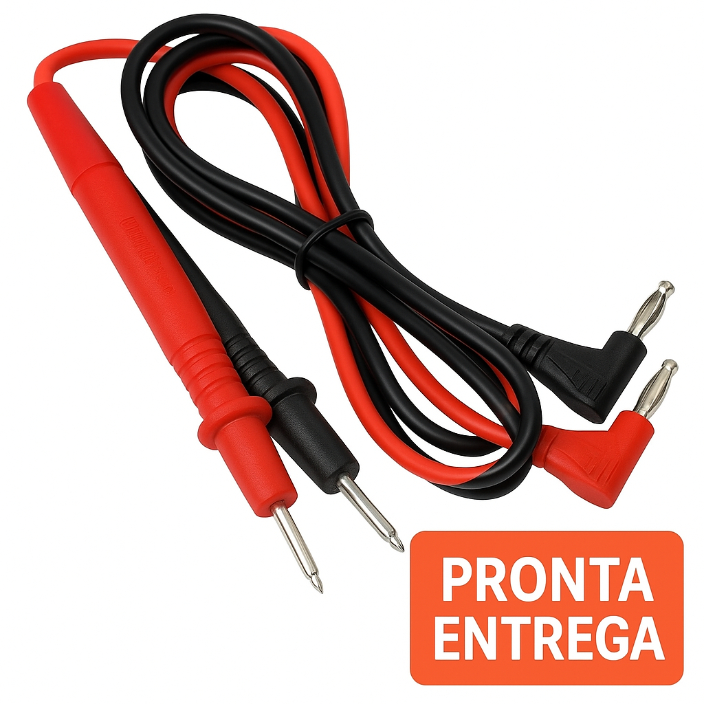Pontas de Prova para Multímetro - Alta Qualidade com Conectores Banana 90° Este cabo de teste com pontas de prova é ideal para profissionais da área elétrica, técnicos, estudantes e hobbystas. Com excelente condução, conectores padrão banana em ângulo de 90° e cores que facilitam a identificação da polaridade (vermelho e preto), é compatível com diversos modelos de multímetro digital e analógico. ✅ ESPECIFICAÇÕES: Tensão Máxima: Até 1000V Corrente Máxima: Até 10A Comprimento: 90cm Conectores tipo Banana 90° Pontas de prova metálicas de alta precisão Compatível com multímetros digitais/analógicos Ideal para testes elétricos e eletrônicos Cabos flexíveis e duráveis 💡 Vantagens: ✔ Ótima condução elétrica ✔ Fácil de conectar e manusear ✔ Produto novo, embalado com cuidado ✔ Envio rápido e seguro