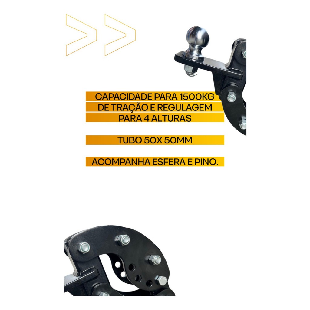 Olá, somos a BIG HORN 4X4 OFF ROAD Estamos aqui para deixar o seu carro mais bonito, funcional e preparado para a diversão, temos este e outros produtos. Todos produtos postados dentro de 24h sem falta. Ponteira Regulável para Engate de Reboque **Descrição:** Apresentamos a Ponteira Regulável para Engate de Reboque, fabricada em aço de altíssima resistência com chapa de acho de 4,25mm, projetada para suportar até 1500 kg de tração e com a versatilidade de 4 alturas ajustáveis. Com tubo robusto de 50x50 mm, acompanha esfera e pino de 50mm. Se você precisa transportar cargas pesadas com total segurança, o engate de reboque é um acessório indispensável! Aqui, você encontra não apenas resistência e durabilidade, mas também a tranquilidade de saber que está investindo em um produto de qualidade superior. Nossos engates de reboque são meticulosamente fabricados e rigorosamente testados para garantir o máximo desempenho e segurança. Com uma vasta seleção de modelos e tamanhos, temos a solução perfeita para atender às suas necessidades específicas. Conteudo da Embalagem: 1x Engate Regulavem + Acompanha esfera e pino. Importante: Valor da Unidade. Imagens Meramente Ilustrativas. Recomendamos que a instalação seja feita por profissional especializado e não nos responsabilizamos pelo mau uso do produto.