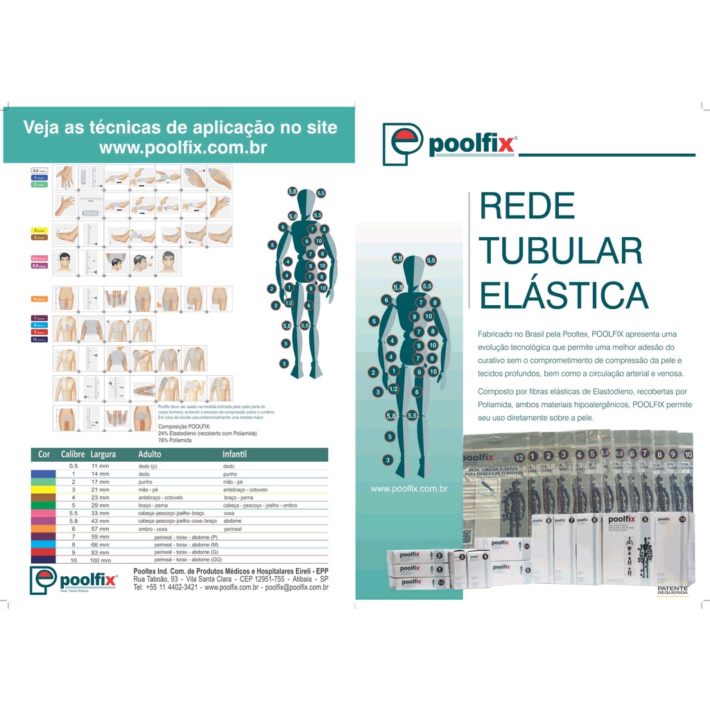 A rede tubular Poolfix é uma alternativa aos fixadores tradicionais de curativos presentes no mercado. A Poolfix se diferencia das ataduras comuns, por ser prática ao manusear, confortável ao vestir e flexível tanto na forma de uso, quanto na mobilidade do paciente. A aplicação consiste em encontrar o calibre adequado para aquela região do corpo e fazer os cortes ou amarrações necessárias. Sim, são apenas dois passos, que eliminam os desconfortos causados por faixas abafadas ou fitas adesivas de forte aderência. O material da Poolfix é composto de Poliamida e Elástodieno recoberto, que além de antialérgico e agradável ao toque, ao ser cortado, não desfia. O produto também mantém a elasticidade mesmo após horas de uso e não precisa ser substituído a cada troca de curativos.
