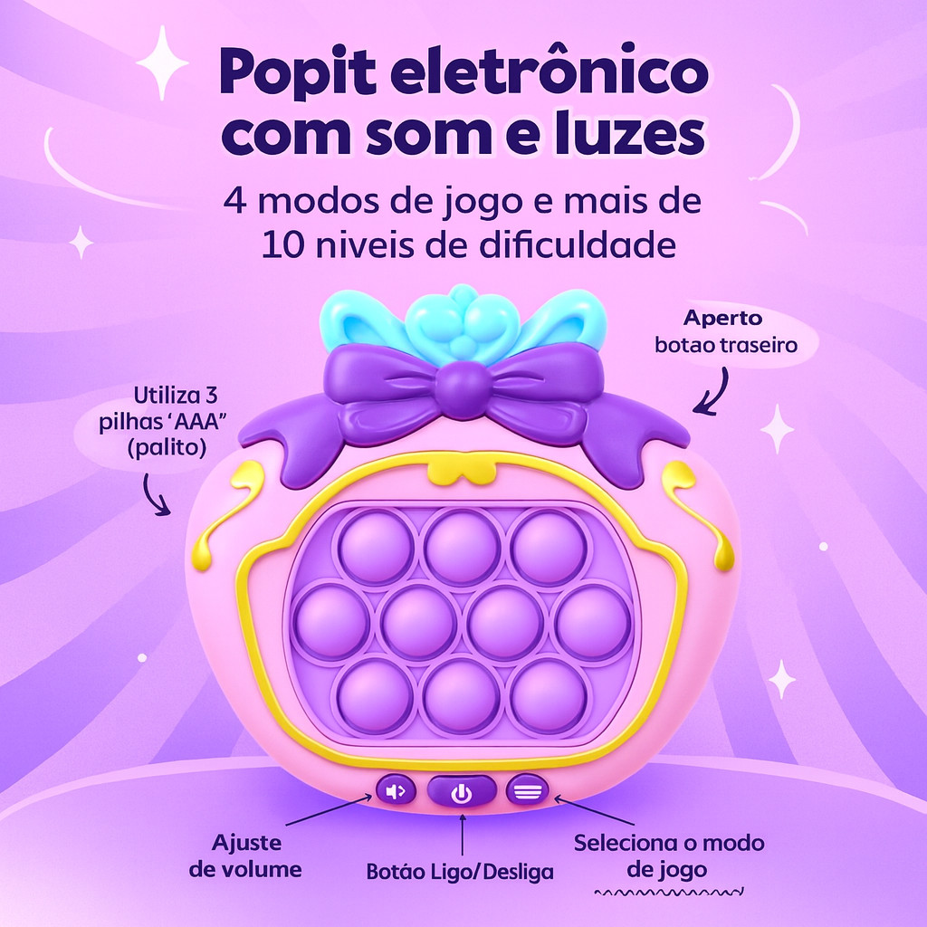 O Pop It Eletrônico é um brinquedo inovador que combina aprendizado e entretenimento em um só produto. Com quatro modos de jogo distintos — desafio, memória, pontuação e multiplayer — e mais de dez níveis de dificuldade, ele estimula habilidades como raciocínio lógico, coordenação motora e concentração. Além de ser um jogo divertido, também funciona como atividade anti-stress para adultos e idosos, tornando-se um item versátil para toda a família. Benefícios e diferenciais Diversão lúdica e educativa Estímulo à memória cognitiva Controle de volume da música Compacto, leve e portátil Indicado para todas as idades Especificações técnicas Material: ABS + silicone Modos: 4 (desafio, memória, pontuação, multiplayer) Níveis: mais de 10 Música: sim, com ajuste de volume Alimentação: pilhas AAA (não inclusas) Cuidados Evitar quedas Não submergir em água Armazenar em local seco FAQ Quantos modos de jogo tem? 4 modos diferentes. Precisa de internet? Não, é independente. Funciona em viagens? Sim, é portátil.