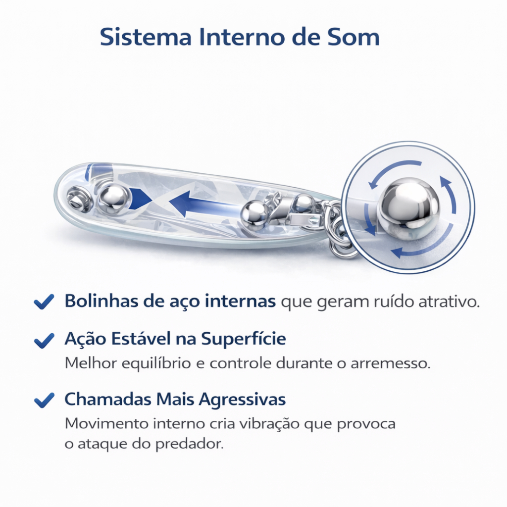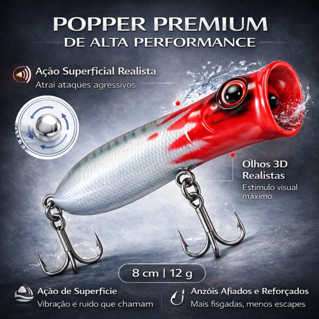 A isca artificial popper é a escolha certa para quem busca mais ataques, mais emoção e mais resultados na pesca esportiva. Desenvolvida para trabalhar na superfície da água, essa isca de pesca artificial imita perfeitamente um peixinho artificial em fuga, atraindo predadores de forma agressiva e natural. Com ação tipo popper / isca pencil artificial, produz sons e respingos que chamam a atenção mesmo em águas paradas ou com pouca visibilidade. É uma isca peixe artificial extremamente eficiente tanto em água doce quanto salgada, ideal para pescadores iniciantes e experientes. Indicada para espécies como traíra, tucunaré, robalo e black bass, essa isca artificial para traíra oferece alta taxa de fisgadas graças ao seu design equilibrado e anzóis resistentes. Seu tamanho compacto faz dela também uma excelente isca pequena artificial, fácil de arremessar e controlar. Produzida em material resistente, é uma isca pesca artificial durável, com excelente desempenho mesmo após várias pescarias. Se você procura iscas artificiais pesca que realmente funcionam, essa é uma opção confiável e versátil para diferentes ambientes e técnicas. Seja para rios, lagos, represas ou pesca costeira, esta isca de pesca artificial entrega ação, realismo e eficiência, aumentando suas chances de captura desde o primeiro arremesso. 👉 Ideal para quem quer mais ataques, mais adrenalina e melhores resultados na pesca esportiva.