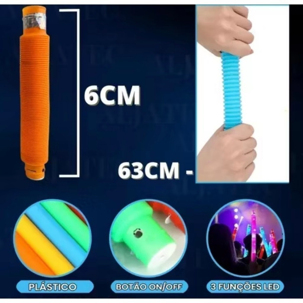 Apresentamos o conjunto de 6 Poptube Com Led Tubo Fidget Tube Toys Folding Pop It Cor Colorido, um brinquedo perfeito para crianças e adultos. Este produto é feito de plástico resistente e tem um diâmetro de 2 cm. O design colorido e atraente é complementado por luzes LED, tornando-o ainda mais divertido e interessante. Este é um brinquedo telescópico, o que significa que pode ser estendido e retraído para diferentes formas e tamanhos. Além disso, é um excelente brinquedo anti-stress, ideal para pessoas com autismo. POP TUBE GRANDE - KIT COM 6 PEÇAS *CARACTERÍSTICAS* Material: ABS/PE Gênero: Unissex Medidas: 2,9 cm de diâmetro 19 cm de comprimento retraído 63 cm comprimento esticado *SOBRE O PRODUTO* Os Pops Tube Fidget toy são fáceis de transportar e são a primeira escolha para festas brilhantes, aniversários, carnavais, casamentos, camping, jogos em família, viagens de longa distância, entre outras ocasiões. É um brinquedo adequado para qualquer pessoa, desde crianças, adultos e idosos, sendo uma excelente ferramenta sensorial e educativa! São ótimos como uma ferramenta de ensino para autismo, questões sensoriais e déficits visuais. Alguns outros benefícios são: - Ótimo para exercitar o raciocínio lógico; - Estimula a criatividade; - Auxilia a reconhecer cores, números, letras e formas, fornecendo estimulação tátil, habilidades motoras finas e feedback audiovisual; - Prevenção na degeneração cerebral; - Suaviza o stress e a ansiedade; - Material leve de exibição luminosa, pode ser utilizado em qualquer lugar, sendo para brincadeiras, festas, de acordo com a sua imaginação e até mesmo para decoração! O Pop Tube é diversão garantida! ITENS INCLUSOS • Pop Tube Fidget Toy de Led OBS: As CORES e MODELOS serão enviadas de acordo com a disponibilidade em estoque.