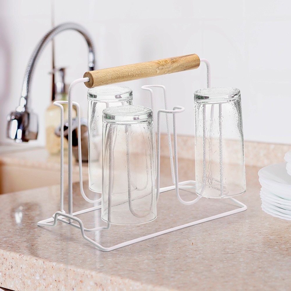 Porta 6 Copos Escorredor Suporte C/ Alça Bambu Metal Branco