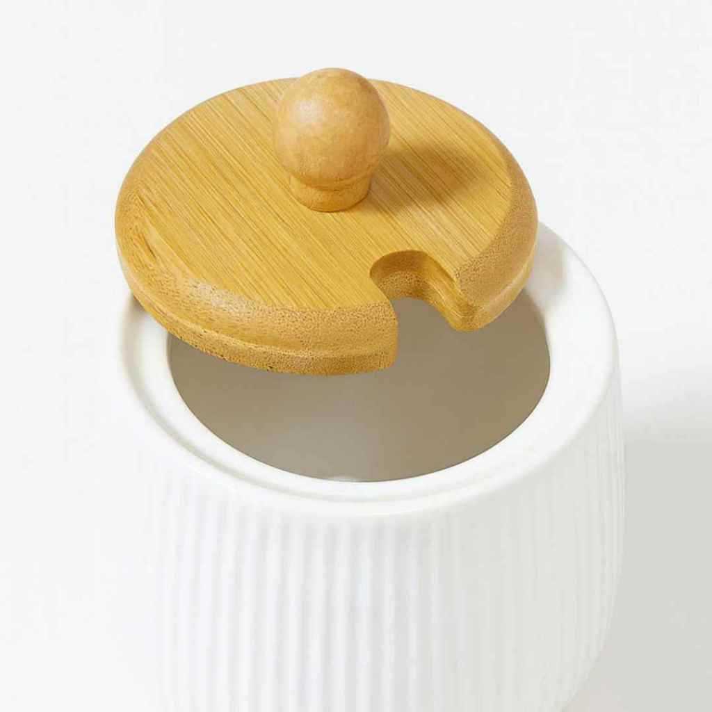 Porta Açucareiro Saleiro Temperos Branco Tampa Bambu Colher de Cerâmica Design Minimalista e Sofisticado para Cozinha