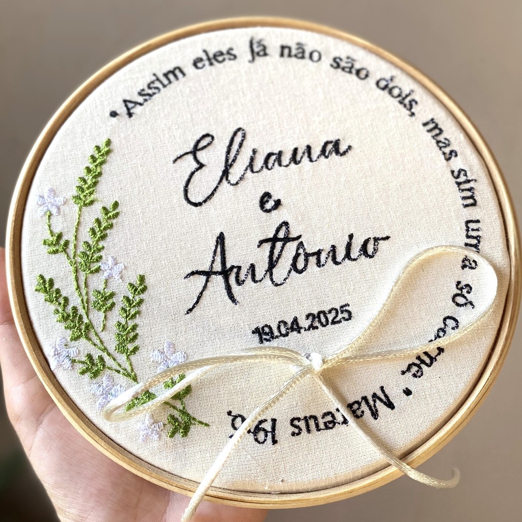O porta alianças é um detalhe único e especial que torna a cerimônia ainda mais inesquecível. Este modelo delicado traz raminhos florais bordados e uma frase personalizada, unindo romantismo, elegância e significado. Uma peça artesanal feita com carinho para marcar o momento mais emocionante do casamento. 📏 Dimensão disponível: 16cm e 20cm 🎨 Personalização: Informe no chat os nomes dos noivos, a data do casamento, as cores desejadas e a frase escolhida. ⏳ Prazo de produção: até 15 dias (para urgência, consulte no chat a possibilidade de adiantamento). ⚠️ Atenção: Pode haver pequenas variações na cor do produto devido à iluminação da foto e configurações de tela de celular/computador. 📦 Envio: O pedido será enviado para o endereço cadastrado na plataforma. 🚚 Não nos responsabilizamos por atrasos de transportadora ou Correios. 📜 Política de cancelamento e devolução: Por se tratar de um produto artesanal e personalizado, feito exclusivamente para cada cliente, não é possível realizar cancelamentos ou devoluções (conforme Art. 49 do Código de Defesa do Consumidor – exceção para produtos personalizados). ✍️ Importante: Se o cliente não enviar os nomes, a data e a frase para personalização, enviaremos o bordado apenas com a arte escolhida. Sem nome, data ou frase.