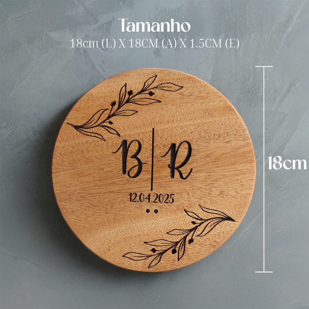 PORTA ALIANÇA CASAMENTO MADEIRA RÚSTICO PERSONALIZADO ANEL O casamento é um dos dias mais especiais na vida dos noivos. Pensando nisso que surgiu esse porta aliança, tornar o dia mais especial ainda, dando um toque rústico a data e combinando com a decoração. Feito 100% em madeira, possui grande resistência, além de um design bonito e delicado. E pode ser guardado como uma lembrança do grande dia. Sobre a personalização: Após realizar a compra, favor mandar as iniciais dos noivos e a data do casamento. Favor ficar atento as notificações, pois temos 3 dias úteis para fazer o envio do pedido, após a compra enviamos um modelo para aprovação, caso não recebamos os dados ou a confirmação do modelo e enviaremos o modelo como estiver, ou com frase genérica. Informações técnicas Medidas: 18cm (L) x 18cm (A) x 1.5cm (E) Cor: Madeira Natural Acompanha cordão de sisal para amarrar as alianças. Atenção: FOTOS REAIS DO PRODUTO, PORÉM A TELA DO SEU CELULAR OU COMPUTADOR PODE INTERFERIR NA COR DO PRODUTO, PODENDO O PRODUTO REAL SER UM POUCO MAIS CLARO OU ESCURO DO QUE NA IMAGEM. Possíveis dúvidas: - O que vem no pacote? Um porta Aliança + cordão de sisal.