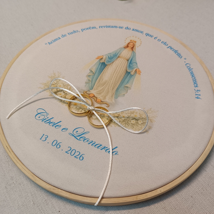 O porta aliança Nossa Senhora das Graças é a escolha perfeita para um casamento religioso cheio de fé, proteção e significado. A imagem transmite devoção e bênçãos para a nova família que está se formando, tornando o momento da troca das alianças ainda mais emocionante e especial. Um detalhe delicado e espiritual para eternizar seu grande dia com amor e confiança na proteção de Nossa Senhora. Especificações do Produto: Produto: Porta-aliança para casamento Material: Bastidor de bambu com tecido sublimado Técnica: Sublimação em tecido Diâmetro: 20 cm Personalização disponível: Nomes dos noivos; Data do casamento; Frases ou versículos. Produção: Sob encomenda Prazo de produção: Até 7 dias úteis Itens Inclusos: 1 porta-aliança personalizado 1 suporte enviado como cortesia ⚠️ Informações Importantes: Produto desenvolvido de forma artesanal, podendo apresentar pequenas variações naturais entre as peças. As cores podem sofrer variação conforme lote de produção, tipo de tecido, tonalidade das fitas, além de diferenças causadas por iluminação, ângulo das fotos ou configurações de tela do dispositivo. Essas variações fazem parte do processo artesanal e não interferem na funcionalidade do produto. ⚠️ Personalização e Prazos: As informações para personalização devem ser enviadas em até 24 horas após a confirmação do pedido. Caso não haja envio das informações dentro desse prazo, o produto seguirá para produção sem personalização, conforme o modelo apresentado nas imagens. Após o início da confecção, não é possível realizar ajustes nas informações enviadas. Antes de concluir a compra, confira atentamente os dados de entrega. Informações incorretas podem impactar o prazo de recebimento. O prazo final considera tempo de produção + envio, podendo variar conforme a localidade. ⚠️ ATENÇÃO: Por se tratar de um produto personalizado, não realizamos alterações após a aprovação da arte. Conforme o Art. 49 do Código de Defesa do Consumidor, o direito de arrependimento não se aplica a produtos personalizados após o início da produção.