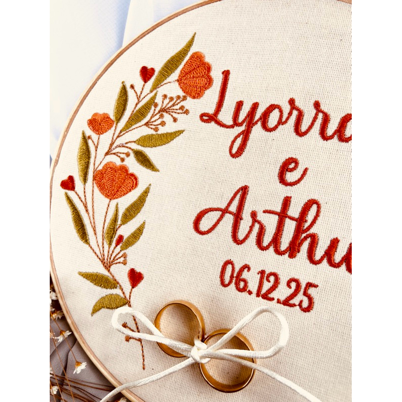 Este porta-aliança é ideal para cerimônias de casamento, ensaios fotográficos e até mesmo como lembrança do grande dia. Produzido em aro de 20 cm e bordado à máquina, traz acabamento refinado e duradouro. É uma peça versátil, que pode ser confeccionada em diferentes estilos e cores, conforme o gosto dos noivos. Personalizamos de acordo com sua preferência para que o porta-aliança seja único e inesquecível.
