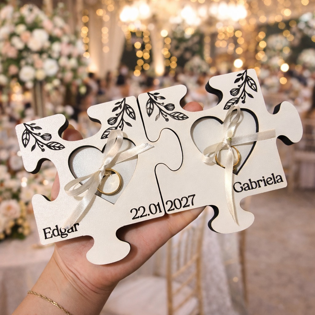 Porta Aliança Romântico com Nomes – Estilo Quebra-Cabeça Rústico Country Personalizado