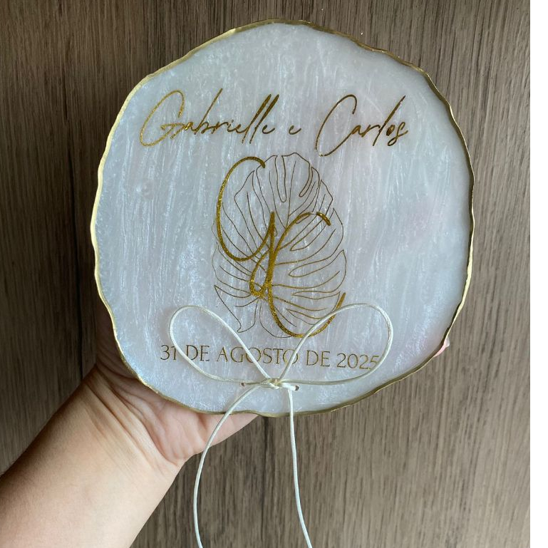 💍 Porta Alianças em Resina Personalizado 15/16cm – ACOMPANHA SUPORTE PLASTICO Estilo Geodo **SE ATENTE AS DATAS DE ENTREGA ANTES DA COMPRA ( no frio as peças estão demorando mais para secar , consequentemente os envios estão sendo no último prazo de entrega )** Torne seu grande dia ainda mais especial com um porta alianças exclusivo, feito à mão em resina no formato geodo redondo, com acabamento plano e abaulado. ✨ Características: Formato: Redondo estilo geodo, superfície abaulada ou plana Material: Resina de alta qualidade Personalização: Nome dos noivos + data do casamento (ou frase especial) Tamanhos: Aproximadamente 16 cm de diâmetro Cores disponíveis: Escolha entre tons clássicos, rosé, dourado, transparente com flores secas, etc. Detalhes opcionais: Inclusão de flores secas, brilho perolado ou folha dourada Ideal para: Casamentos, noivados, ensaios fotográficos e lembranças especiais 🎁 Diferenciais: Feito 100% artesanalmente com muito cuidado Cada peça é única! E UM NUNCA SERÁ IGUAL AO OUTRO Personalização gratuita Ótima opção de presente ou recordação Pode Ser usado como item decorativo após o evento 🚚 Entrega e Produção: Produto sob encomenda – prazo de produção: 15 dias úteis Envio para todo o Brasil com cuidado especial na embalagem Consulte condições de frete grátis ou brinde especial para compras acima de R$100,00 🛒 Como comprar: Escolha a cor desejada Envie os dados para personalização no chat após a compra Receba um produto exclusivo e feito com carinho 💖