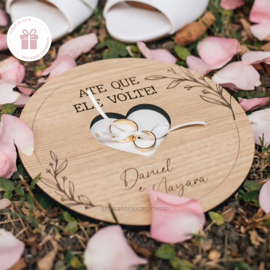 - Detalhes do produto: Porta alianças em MDF de 6mm de espessura laminado, com nomes e data gravados . Personalizado de acordo com nomes e data de casamento. Tamanho 19cm ***A escrita e desenhos são gravados à laser, cor marrom escuro, não é possível alterar.**** - Produção e envio: ENVIAR NO MOMENTO DA COMPRA, PELO CHAT: NOME DO CASAL, DATA E FRASE ( CASO QUEIRA) Temos um prazo a ser cumprido e precisamos das informações para conseguir produzir o porta alianças. ** Caso queira informações sobre personalizações diferentes nos envie no chat ANTES DA COMPRA. ** *** ARTE ENVIADA NO CHAT EM 1 A 2 DIAS APÓS A COMPRA*** Caso a arte não seja aprovada no prazo de 24h, a peça será enviada sem aprovação, pois não podemos descumprir o prazo da plataforma. *** BRINDE ENVIADO DE FORMA ALEATÓRIA, CONFORME DISPONIBILIDADE, NÃO É POSSÍVEL ESCOLHER*** ATENÇÃO - O prazo de entrega fornecido pelos correios não é de nossa responsabilidade, e não temos garantia do cumprimento. O único prazo que está sob nossa responsabilidade é o de produção e postagem. Caso precise para uma data próxima, considere possíveis atrasos. OBS.: Pode haver pequenas divergências entre a cor da foto e do produto devido à diferenças de iluminação e configuração de cor do celular ou monitor.