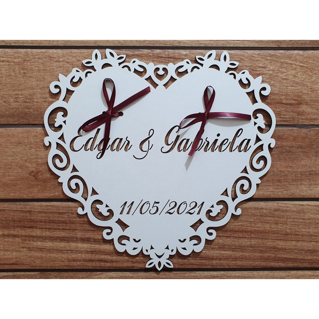 Descrição 01 Porta Alianças Coração - Mdf Dimensões: 30cm Largura x 29cm Altura OBSERVAÇÕES -Produzido em Mdf 3mm Branco -Cor Branco frente e verso cor Crú -Corte a Laser -Item Personalizável apenas para os nomes e data -Fita de cetim disponíveis nas cores: Branco, Vermelho, Marsala, Rosa Claro, Azul Claro. -Não incluso alianças ATENÇÃO -Lembre-se que, para itens personalizados, dependemos das suas informações para a produção, portanto, quanto antes nos informar as devidas descrições de personalização, seu pedido terá início de produção. -Caso não seja informado os dizeres para a personalização em até 12h, após a compra, será enviado com a frase: Par Perfeito. - Caso não seja informado a cor para o cetim, será enviado aleatoriamente. Preço, versatilidade e qualidade pensando em você! Boas Compras : )