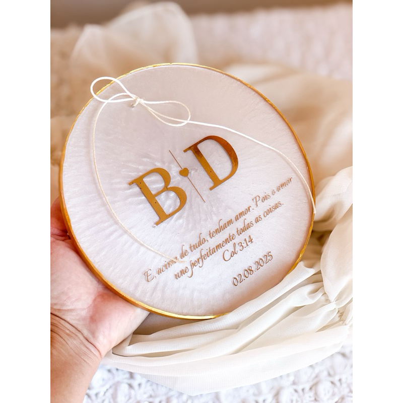Porta alianças casamento personalizado branco perolado com detalhes em dourado. **NÃO CRIAMOS MONOGRAMAS** Medida: 20 cm de diâmetro Material: resina Prazo para produção: 15 dias úteis (ou seja, não conta sábados, domingos e feriados) Acompanha suporte de acrílico. **Logo após a compra informar os dados por mensagem.** Devido à natureza fluida da resina e do pigmento perolado, cada peça apresenta padrões únicos. Pequenas variações de pigmentação são características do processo artesanal e tornam sua peça exclusiva. Esses detalhes não são considerados defeitos, mas sim a assinatura do trabalho feito à mão.
