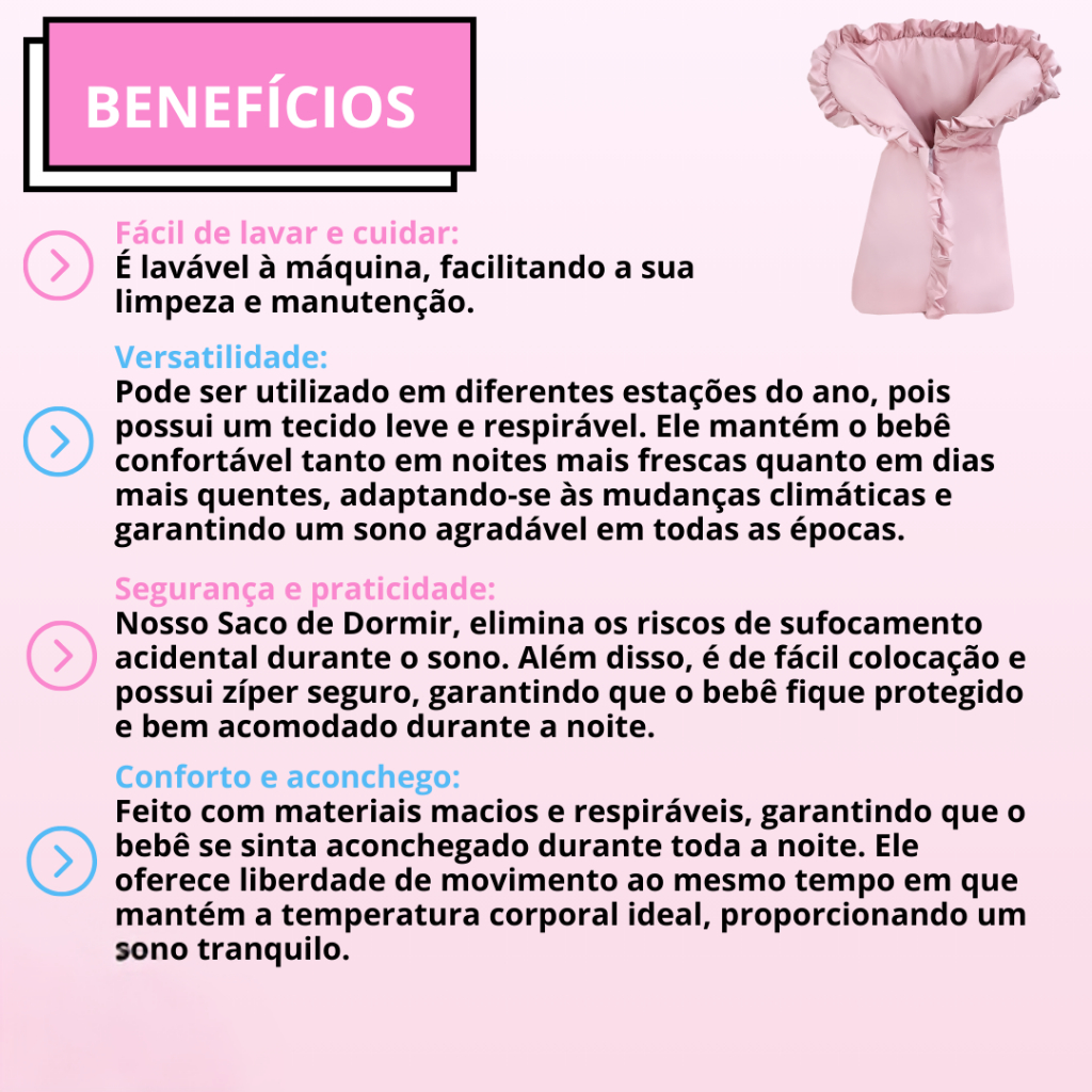 Olá, bem-vindo(a) à nossa loja! O que você vai receber? 01 Porta Bebê Acolchoado em formato de Saco de Dormir. - Especificações do Produto: Medidas quando fechado: 0,65m (Comp.) x 45cm (Larg.) Medidas quando aberto: 0,65m (Comp.) x 0,60m (Larg.) Tecido: Micro Amaciado. Enchimento: Ultra macio para o máximo conforto do bebê. 💡 Uso Ideal: Perfeito para aconchegar e proteger os recém-nascidos durante os passeios e transporte nos primeiros meses de vida, proporcionando um ambiente seguro e aconchegante. Seguro & Confortável: Design pensado para garantir a segurança e o conforto total do seu pequenino. Feito com Amor: Cada detalhe desenhado e elaborado com muito carinho. Pele de Bebê Protegida: Não pinica, não causa alergia, não assa e não coça a delicada pele do bebê. Zíper Prático: Zíper frontal ao longo de toda a extensão para facilitar o uso. ❓ Dúvidas Frequentes: Produtos Novos? Sim, todos os nossos produtos são novos. Mesmo Produto da Foto? Sim, as fotos representam exatamente o que você vai receber. Boa Qualidade? Absolutamente! Nos dedicamos a oferecer produtos de indiscutível qualidade e com preços justos. Prazo de Despacho? Sempre. 📬 Envio e Entrega: Estamos comprometidos em enviar seu pedido o mais rápido possível. O prazo de entrega começa a contar a partir da postagem e varia de acordo com o método de envio escolhido. 🗣️ Estamos Aqui para Você! Tem mais dúvidas? Quer conversar? Estamos disponíveis no chat para ajudar você!