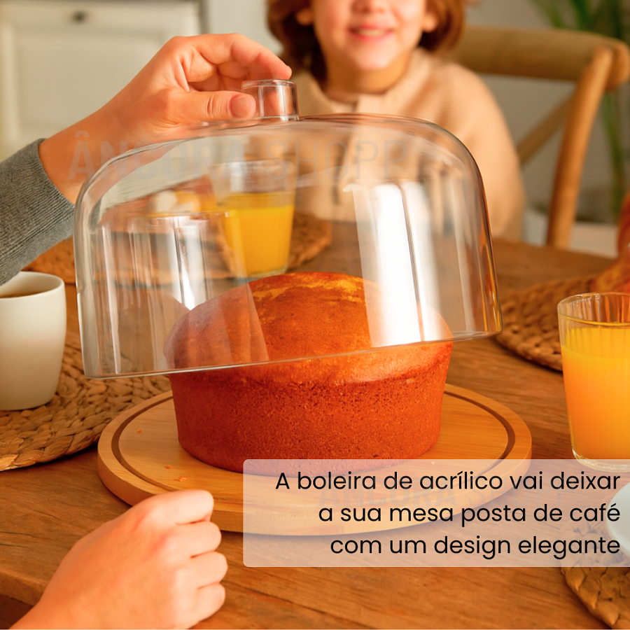 Porta Biscoitos Bolos Pão Boleira com Cúpula Tampa de Acrílico 30cm Bandeja de Bambu