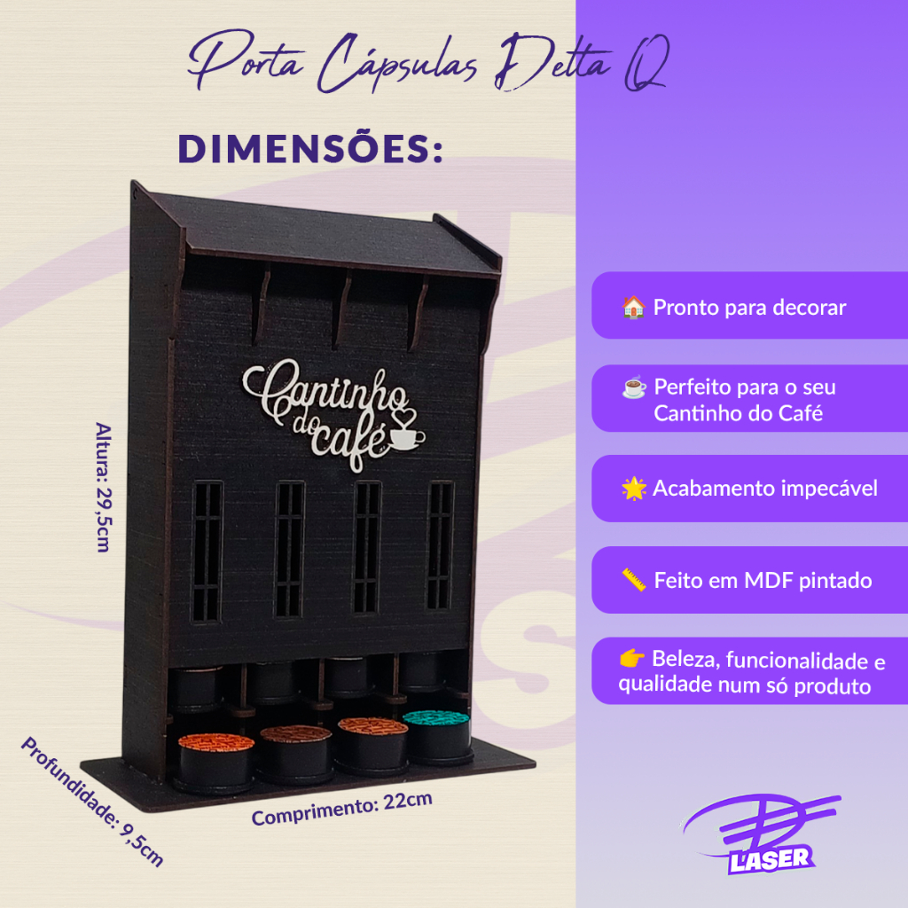 Porta Cápsula Delta Q - Preto Você já pensou em ter um Porta capsulas feito para proporcionar um aspecto de requinte e modernidade no seu CANTINHO DO CAFÉ com capacidade de até 40 capsulas exclusivas para os modelos de cafeteiras da DELTA Q? É um produto para quem gosta de organização e praticidade, pois com ele você organiza suas cápsulas e ainda por cima decora seu CANTINHO DO CAFÉ, deixando-o ainda mais agradável. O nosso porta cápsulas além de bonito, moderno é também compacto e super resistente! Sem dúvida alguma você irá AMAR!!! - ESPECIFICAÇÕES - MDF: 3mm Comprimento: 22 cm Largura/Profundidade: 9,5 cm Altura: 29 cm Peso: 462g Capacidade: 40 cápsulas Delta Q (não inclusas) Cor: Preto (pintura em gel brilhante atóxico e sem cheiro, trabalho feito à mão) Estoque a pronta entrega! Todas as fotos são de produtos reais e de exclusividade do Planet Next. O uso sem autorização pode ocasionar penas de acordo com as leis de direitos autorais. - OBSERVAÇÕES: - a) A tonalidade do produto pode variar de acordo com a resolução da tela; b) Os objetos que ambientam as fotos não acompanham o produto; c) Cuidados especiais: não deixar em contato direto com a água, limpar somente com um pano levemente umedecido; d) Caso tenha algum problema após a sua compra, conte com a nossa equipe de pós-venda para solucionar com a maior agilidade. e) Não alteramos características do modelo. Não acrescentamos gravação (nome, data ou qualquer informação) no produto ou na base. f) Utilizamos o emissor de Nota Fiscal automático da plataforma, portanto não temos como alterar nenhum dado. Tanto a nota fiscal como a etiqueta de envio, serão conforme as informações cadastradas e confirmadas pelo comprador no momento da compra. g) Não é emitido nota fiscal para terceiros. h) Todas as fotos são de produtos reais e de exclusividade da DF LASER, sendo assim o uso não autorizado das imagens poderá acarretar em punições de acordo com a lei de direitos autorais. - GARANTIA: - Garantia de 7 dias contra defeito de fabricação; Executar a conferência no ato do recebimento. Seu produto é extremamente bem embalado para que não ocorra nenhum contratempo durante o processo de entrega e assim o receba perfeitamente como saiu de fábrica!! Caso tenha algum problema após a sua compra, conte com a nossa equipe de pós-venda para solucionar com a maior agilidade! Estamos à disposição. porta cápsulas delta q, organizador de cápsula delta q compacto, organizador de cápsulas delta q, suporte cápsulas delta q, porta cápsulas café delta q, porta cápsulas compacto