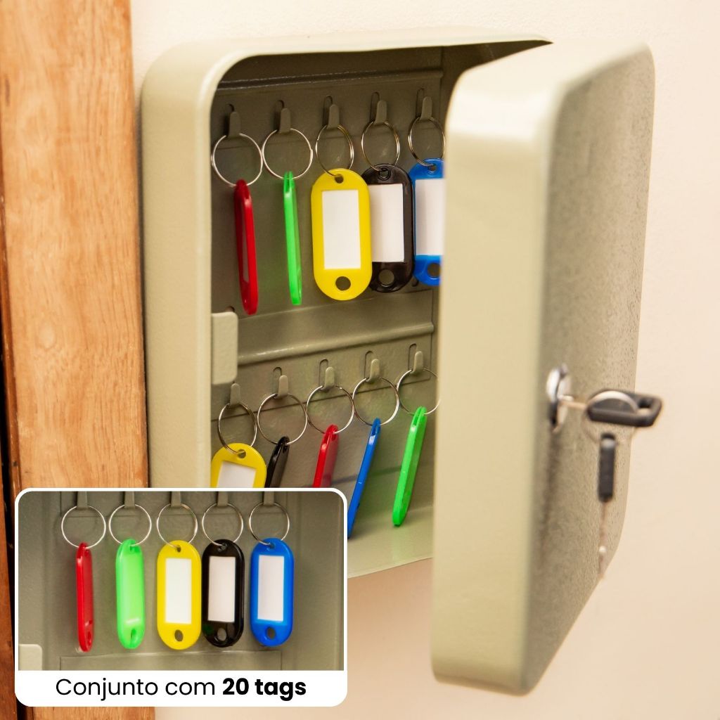 PORTA CHAVE CLAVICULÁRIO PEQUENO CHAVES- KONTUZ Mantenha suas chaves sempre organizadas e seguras! O Porta Chave Claviculário Kontuz é a solução ideal para quem busca organização doméstica e um design funcional para o lar. Compacto e seguro, ele possui tranca com chave e acompanha TAGs coloridas para identificação, proporcionando praticidade no dia a dia. CONTEÚDO DA EMBALAGEM: * 1 Claviculário; * TAG identificadoras. ESPECIFICAÇÕES: * Com TAG para identificação; * Tranca na chave; * Tamanho grande; * Acabamento arredondado; * Marca: KONTUZ. MEDIDAS DO PRODUTO: * Claviculário 20 chaves: (CxAxL) 7,4x20x16cm * Claviculário 48 chaves: (CxAxL) 7,6x25x18cm * Claviculário 93 chaves: (CxAxL) 8x30x24cm IMPORTANTE: Garantia: 3 Meses a partir da data de recebimento - para defeitos de fabricação (não cobrimos mau uso). *Todos os Direitos Reservados Em caso de cópia dessa descrição e fotos, os responsáveis serão cobrados de acordo com a Lei (9.610/98) de Direitos Autorais.*