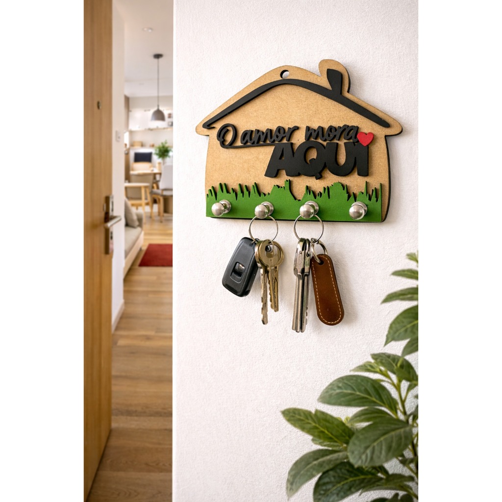 LOJA OFICIAL CONCEITO CRIATIVO Porta chaves de parede em MDF, ideal para organizar e decorar sua casa com estilo minimalista. Design decorativo que combina com entradas, cozinhas e ambientes modernos. Funcional, elegante e pronto para facilitar seu dia a dia. ============================================================================= 📦 O que você recebe: ✔ 01 Porta-Chaves decorativo em MDF, conforme modelo escolhido. ============================================================================= 🎨 UNIDADE: Escolha uma das frases abaixo: “O Amor Mora Aqui.” “Família ❤️” “Gratidão” ============================================================================= 📏 Informações do Produto: MDF MDF madeira 3mm Tamanho: 16x14 Produto ideal para decoração da sala, quarta, escritório. 🧐OBS.: - Para limpeza utilize apenas um pano seco, não utilize produtos químicos, para garantir a durabilidade. - Manter em ambiente interno para maior durabilidade do acabamento. ============================================================================= ⚠️ Escolhi o produto, e agora? Nossos vendedores vão enviar uma mensagem no prazo de 24h. ============================================================================= 🎨 Observação: As imagens são ilustrativas, pequenas variações de cor podem ocorrer conforme o monitor e a iluminação. ❓ Dúvidas Frequentes: ✔ Produto pronto para uso. ✔ Atendimento disponível pelo chat Shopee para qualquer dúvida. 🛒 Garanta já o seu e deixe sua casa ainda mais organizada e acolhedora!