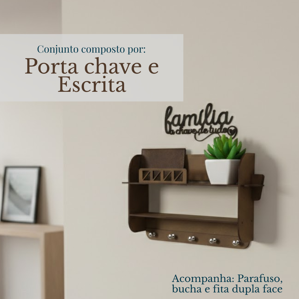 Sabe aquele cantinho bagunçado da entrada da casa? Ele vai se transformar com esse Porta Chaves e Cartas funcional e moderno! 😍 Ideal para quem valoriza praticidade sem abrir mão da beleza, ele foi pensado para deixar tudo no lugar certo, sempre à mão quando você mais precisa. ✨ Com 5 ganchos resistentes, ele acomoda suas chaves de casa, carro, chaveiros e muito mais. Além disso, possui um compartimento especial para cartas, documentos e correspondências, e ainda conta com duas prateleiras super úteis para guardar carteira, óculos, celular ou aquele item que você nunca quer esquecer. 📦👓📱 ✨ Acompanha a frase especial “Família, a chave de tudo”, um detalhe cheio de significado que transforma o ambiente, trazendo mais aconchego, carinho e personalidade para a entrada da sua casa. Porque mais do que um organizador, este porta-chaves representa o lugar onde o amor mora e onde cada retorno se torna ainda mais especial. 🏡🔑💛 🪵 Fabricado em MDF com 3mm de espessura, ele traz um toque de elegância e modernidade à sua decoração. Seu visual clean combina com qualquer ambiente do mais rústico ao contemporâneo. 🎨 🔧 A instalação é simples e prática: o produto acompanha parafusos e buchas, e vai com manual para encaixe não precisa de cola! Produto enviado desmontado, mas o processo de montagem é rápido e intuitivo. 😉 📐 Dimensões e Detalhes Técnicos: • 5 ganchos para chaves 🔑 • Material: MDF 3mm • Medidas porta chaves: Comprimento: 32 cm Altura: 19cm Profundidade: 8cm • Fixação com parafusos (inclusos) • Medidas da frase: Comprimento: 19 cm Altura: 9cm • Fixação com fita dupla face (inclusos) 🚫 Atenção: Chaves e objetos decorativos das imagens não acompanham o produto. 💡 Um organizador que facilita sua rotina, evita a bagunça e ainda deixa sua casa mais linda. Aposte em praticidade com personalidade! 💖 🏷️ TAGS #PortaChaves #PortaChavesParede #PortaChavesComPrateleira #PortaCartas #OrganizadorDeChaves #SuporteParaChaves #PortaChaveMDF #PortaChavesDecorativo #PortaChaveMadeira #PortaChaveParedeCriativo #PenduradorDeChaves #PortaChavesCasa #PortaChaveiroParede #PortaChavesPreto #DecoraçãoFuncional