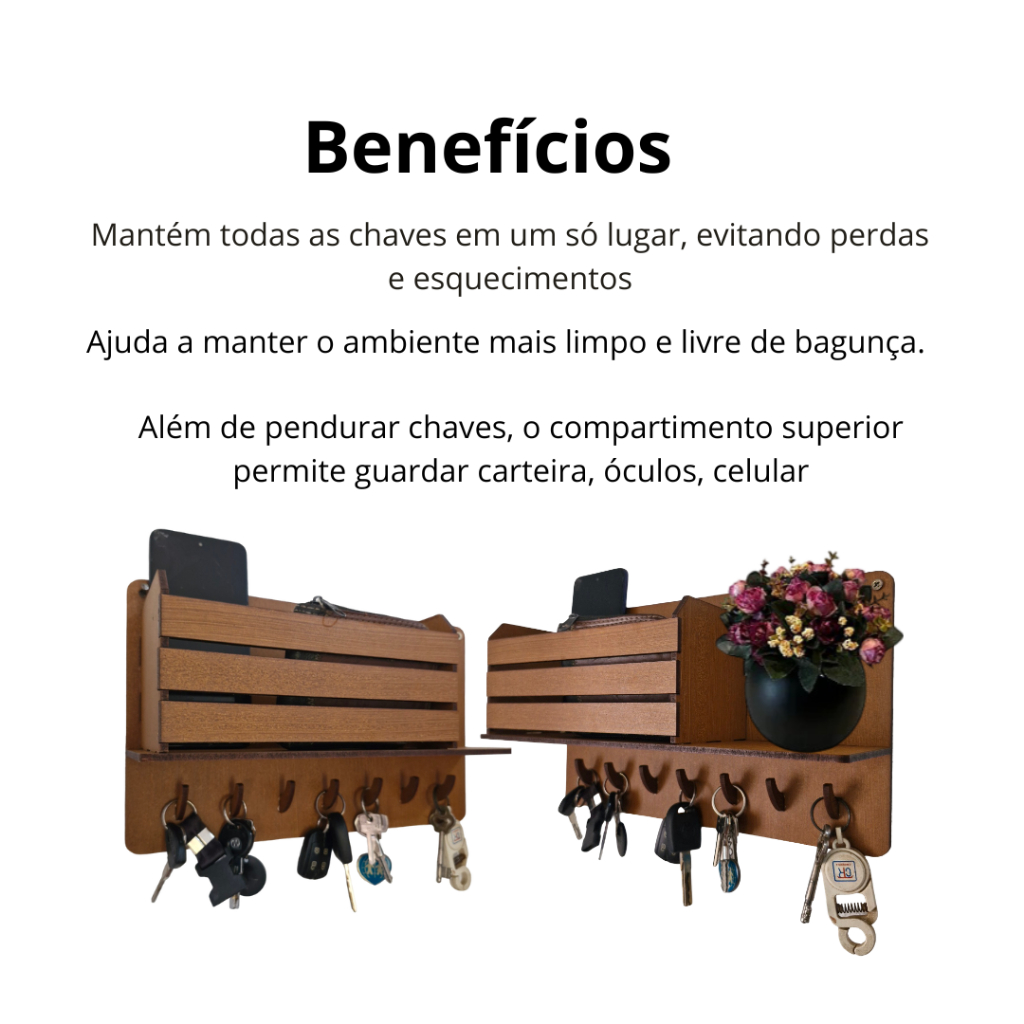 Porta-Chaves com Suporte e Vaso Decorativo – Organização com Estilo para Sua Casa Transforme a entrada da sua casa com este elegante porta-chaves de parede multifuncional! Feito em madeira de alta qualidade, ele une organização e decoração em um único produto. Com 6 ganchos resistentes, você mantém suas chaves sempre no lugar, evitando perdas e atrasos. Além disso, o compartimento superior é perfeito para guardar correspondências, carteiras ou óculos, enquanto o vaso decorativo com flores artificiais dá um charme especial ao ambiente, trazendo um toque acolhedor e moderno. ✅ Material resistente e durável ✅ Design rústico e sofisticado ✅ Vaso com arranjo floral não incluso ✅ Ideal para hall de entrada, corredor ou escritório Garanta já o seu e leve mais beleza e praticidade para o seu dia a dia!