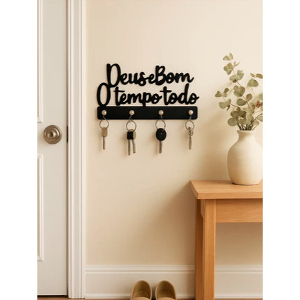 Porta-Chaves Decorativo em MDF – “Deus é Bom o Tempo Todo” Organize suas chaves e ao mesmo tempo decore seu ambiente com uma mensagem cheia de fé e significado. O porta-chaves em MDF “Deus é Bom o Tempo Todo” é perfeito para deixar a entrada da sua casa mais bonita, prática e acolhedora. Com design moderno e vazado, ele traz uma frase inspiradora que combina facilmente com diversos estilos de decoração, como sala, hall de entrada, cozinha ou escritório. Além de funcional, é uma peça decorativa que transmite positividade e espiritualidade para o ambiente. ✨ Características do produto: Fabricado em MDF resistente Frase decorativa: “Deus é Bom o Tempo Todo” 4 ganchos metálicos para pendurar chaves, chaveiros ou pequenos objetos Ideal para hall de entrada, sala, cozinha ou escritório Peça leve, prática e fácil de instalar 📏 Medidas: Comprimento: 24 cm Altura: 12 cm 🏡 Perfeito para: Organizar chaves do dia a dia Decorar ambientes com uma mensagem de fé Presentear amigos e familiares Uma peça simples, elegante e cheia de significado para o seu lar. ✨🔑