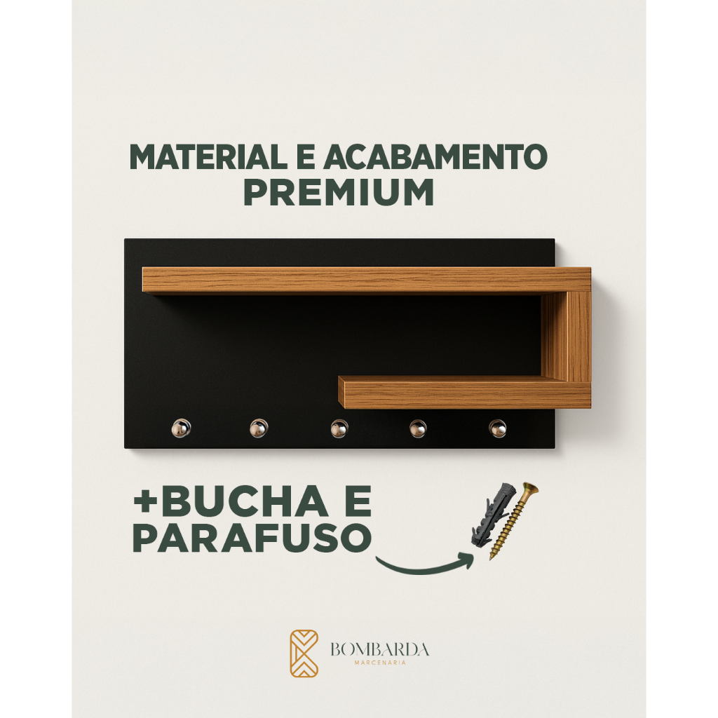 Design Sofisticado e Acabamento Premium Transforme sua entrada ou corredor com este porta chaves de parede produzido em MDF 15mm. Com acabamento refinado e moderno, ele é ideal para manter chaves, carteiras, óculos e pequenos objetos sempre organizados e ao seu alcance. 📐 Medidas Largura: 25cm Altura: 13cm Profundidade: 8cm 📦 O que você recebe: 1 Porta Chaves MDF 15mm com 5 ganchos metálicos; Enviado montado e pronto para fixar na parede; 1 parafuso e 1 bucha para fixação. Tapa furos incluídos para acabamento perfeito. 🎨 Cores Disponíveis Preto com madeira Branco com madeira Cinza fosco Madeira clara 💡 Ideal para: Hall de entrada Corredores Escritórios e consultórios Presentes úteis e decorativos 🔧 Fixação Segura Usamos o mesmo sistema de montagem e fixação de móveis planejados! Prateleiras reforçadas para suportar objetos com segurança e estilo. ✅ Diferenciais Produto artesanal com acabamento premium Enviado montado (não precisa perder tempo montando!)