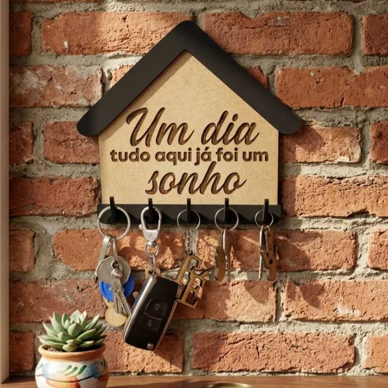 Porta-Chaves Decorativo Premium – Um Dia Tudo Aqui Já Foi Um Sonho 🏠✨ Transforme a entrada da sua casa com um toque de gratidão e elegância! Este porta-chaves exclusivo combina o estilo rústico do MDF com um design moderno e funcional. NOVIDADE: Design com Ganchos Integrados 🚀 Atualizamos nosso projeto! Agora, os antigos pinos de metal foram substituídos por Ganchos de MDF Reforçados na cor preta. Mais Estético: Os ganchos seguem a cor da moldura, criando um visual muito mais limpo e sofisticado. Mais Resistente: Sistema de encaixe passante com travamento traseiro, testado e aprovado para molhos de chaves pesados e chaves de veículos. 100% Ecológico: Produção artesanal própria em material sustentável. Destaques do Produto: Design Bicolor: Contraste elegante entre o MDF amadeirado e os detalhes em Preto Fosco. Mensagem Inspiradora: Frase gravada com precisão a laser, garantindo durabilidade eterna. Corte de Alta Precisão: Acabamento impecável, sem rebarbas e com encaixes perfeitos. Medidas Ideais: 17 cm (largura) x 19 cm (altura) — Perfeito para qualquer espaço. Instalação sem Furos: Peça leve, ideal para fixação com fita dupla face de boa qualidade (já inclusa). Por que escolher este modelo? ✅ Organização com Estilo: Chega de perder as chaves! Organize chaves de casa, do carro e controles de portão em um só lugar. ✅ Versatilidade: Combina perfeitamente com decoração rústica, moderna ou industrial. ✅ Qualidade Garantida: Fabricação própria com atenção aos mínimos detalhes de acabamento. 📍 Disponível para entrega imediata. ✉️ Dúvidas? Chame no chat, teremos prazer em te atender!