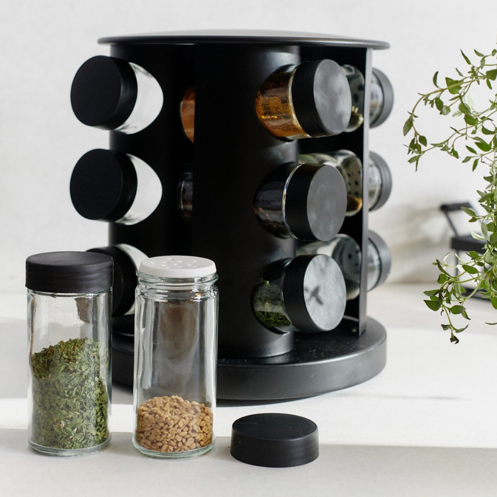 Porta Condimentos Temperos Giratório 6 e 9 Potes Vidro 90G com Tampa Dosadora Preto