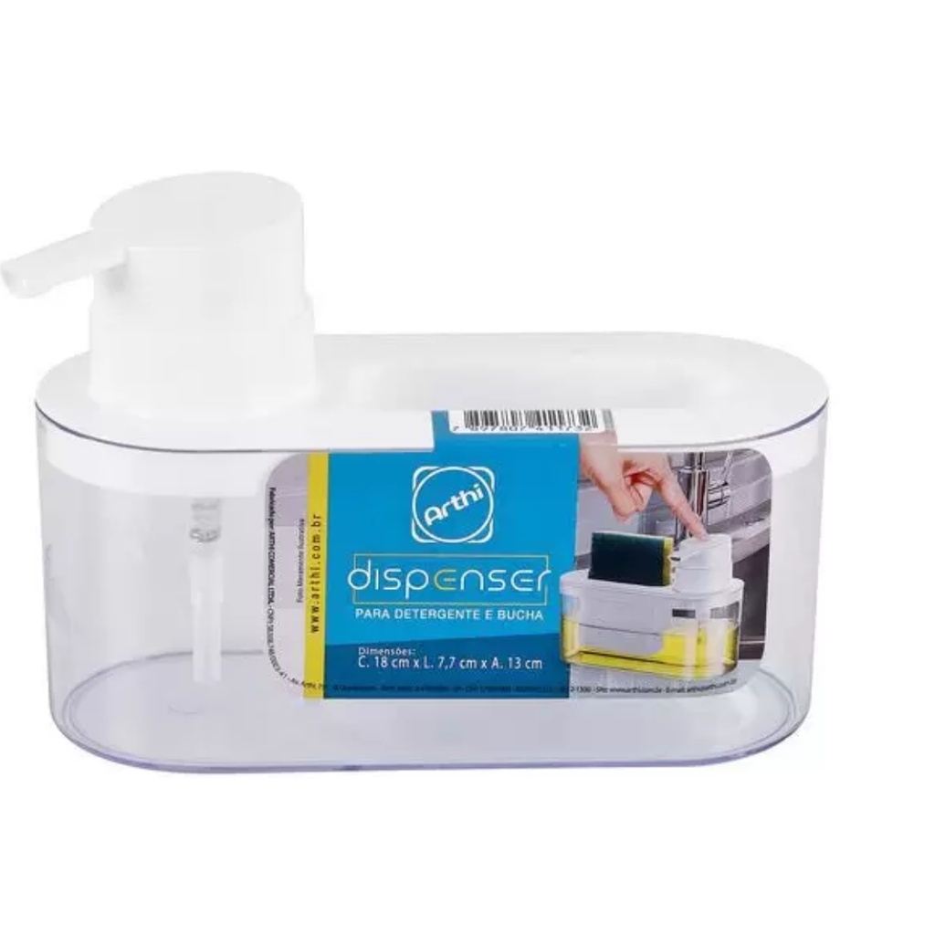 DISPENSER PORTA DETERGENTE E BUCHA ARTHI Manter sua cozinha bonita, prática e moderna nunca foi tão fácil utilizando este acessório da ARTHI. Libere espaço de sua pia/bancada utilizando este acessório que permite o armazenamento destes dois itens fundamentais e de uso diário. Fabricado em Ps cristal, é bonito e resistente. Também possui um bico dosador que possibilita economia do produto utilizado. ESPECIFICAÇÕES FABRICANTE: ARTHI CÓDIGO PRODUTO: 1173 COR: BRANCO DIMENSÕES: C. 18,0 x L. 7,7 x A. 13 cm CAPACIDADE APROX.: 600ml COMPOSIÇÃO: PLÁSTICO / PS CRISTAL *** FOTO MERAMENTE ILUSTRATIVA *** A BUCHA NÃO ACOMPANHA O PRODUTO. OBSERVAÇÕES NÃO PODE DER LAVADO EM MÁQUINAS DE LAVAR LOUÇAS ! ===================================================================== A ARTHI desenvolve produtos modernos com design exclusivo que deixam o seu ambiente muito mais bonito. Tenha mais praticidade para o seu dia a dia com as maravilhosas utilidades domésticas da marca ARTHI. A ARTHI é uma conceituada empresa e sinônimo de qualidade com mais de 25 anos de tradição e uma das maiores fabricantes de Utilidades Domésticas do mercado Brasileiro.