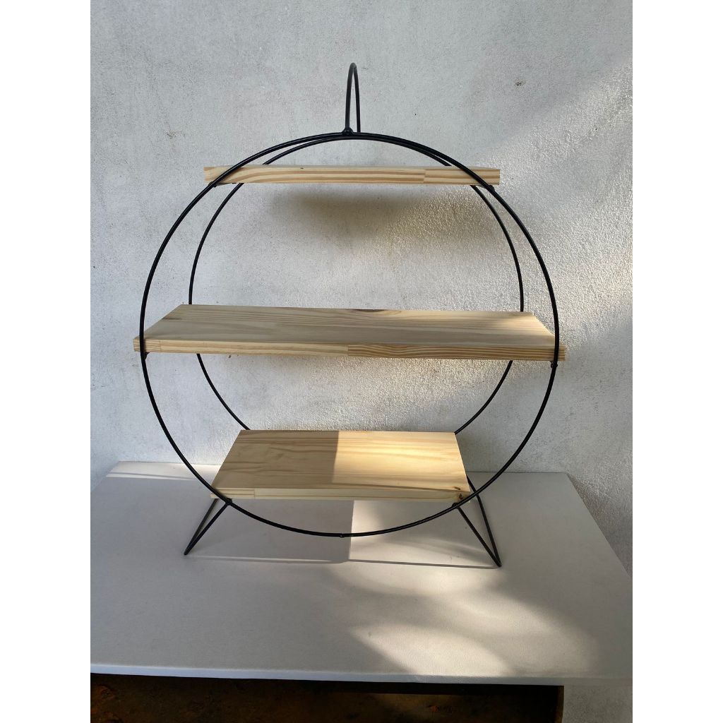 SUPORTE PARA DOCES E SALGADINHOS REDONDA COM PRATELEIRAS EM MADEIRA NATURAL PINUS PARAFUSADAS .FERRAGEM EM PINTURA ELETROSTÁTICA PRETA SEMI BRILHO MADEIRAS EM PINUS SÃO CRUAS NÃO TEM VERNIZ PARA NÃO CONTAMINAR OS ALIMENTOS INDICAMOS PASSAR PLASTICO FILME .SUPORTE DELICADO COMBINA COM TODAS AS DECORAÇÕES .#### MEDIDAS #####ALTURA TOTAL 64 CMPRIMEIRA MADEIRA DE CIMA 32X12SEGUNDA MADEIRA DO MEIO 52X12TERCEIRA MADEIRA ULTIMA 34X12