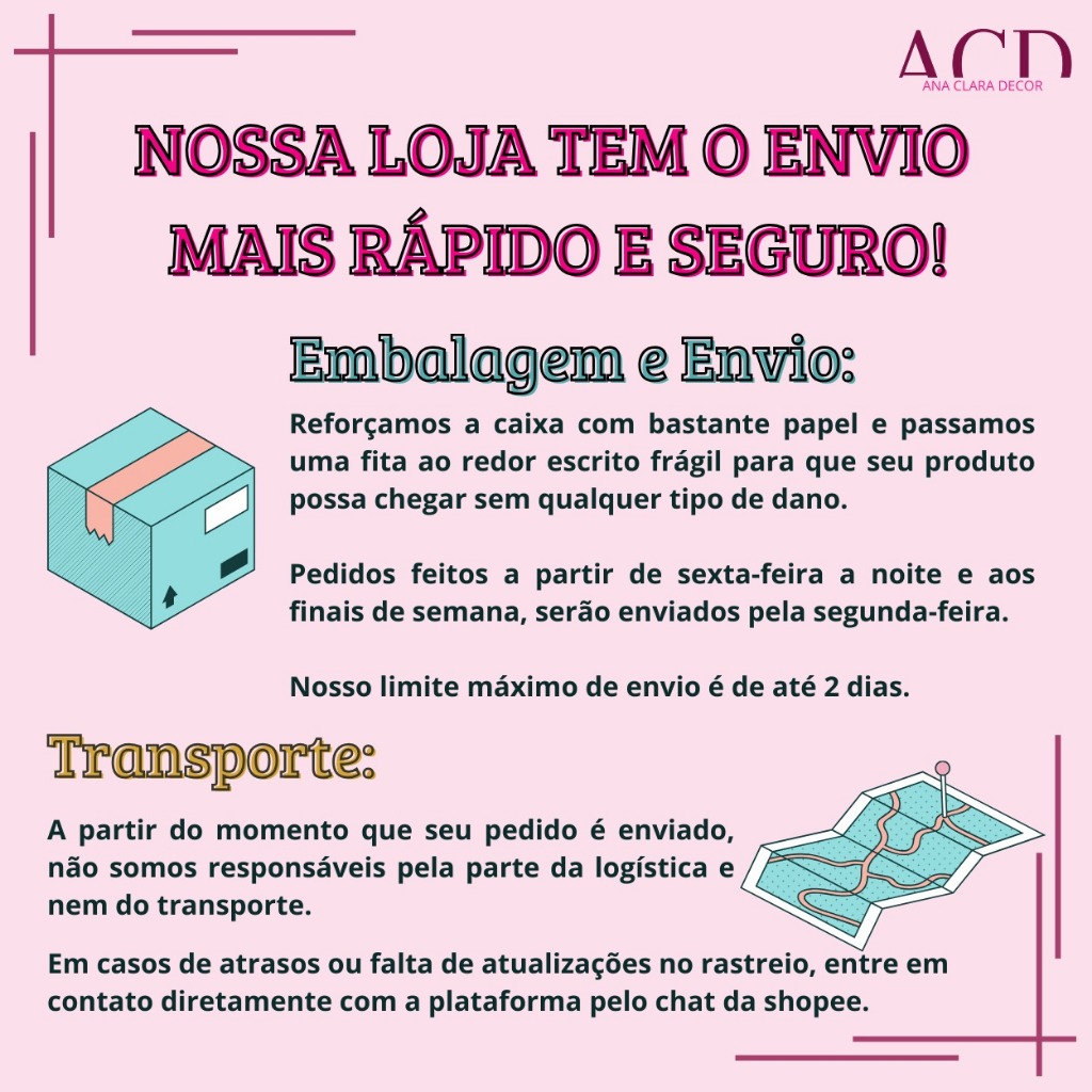 Olá, boas vindas a loja Ana Clara Decor! Aqui você encontrará diversos produtos que deixarão sua casa ainda mais aconchegante, e a sua festa com ainda mais personalidade. Venha já conferir e levar nossos produtos para sua casa! MEDIDAS DOS ITENS Altura: 5 cm Largura: 15,5 cm Comprimento: 18 cm PERSONALIZADOS Caso queira uma cor que não está disponível nas variações, confira se ela vai estar presente em nossa tabela de cores que estará junto as fotos do anúncio. Pedimos para que coloque as cores desejadas na descrição antes de finalizar a compra, devido a alta demanda de pedidos e mensagens no chat, isso nos ajuda a se organizar para poder entregar um melhor auxilio e desempenho para todos, além de evitar possíveis erros em relação ao envio do produto. Isso também é válido para produtos que possuem 2 unidades e você deseja realizar a alteração de 1 delas. CANCELAMENTOS/ESCOLHA DE VARIAÇÕES ERRADAS Caso você deseje mudar a cor do seu produto, porém já tenha sido realizado o pagamento. Recomendamos você a fazer o cancelamento e realizar a compra normalmente com as cores certas, isso devido a explicações dadas anteriormente. Além de não podermos realizar o cancelamento do pedido. Em qualquer caso de dúvida, entre em contato com o chat da shopee, que vão estar te auxiliando de forma mais assertiva. PRODUÇÃO E QUALIDADE Os nosso produtos são feitos e pintados de forma totalmente manual, buscando sempre usar os materiais de mais alta qualidade. EMBALAGEM Embalamos seu pedido de uma forma que ele não seja danificado durante o percurso de entrega, procurando sempre envolver o item em plástico e preencher o espaço das caixas com muito papel, assim evitando qualquer tipo de dano material. ATENDIMENTO Respondemos qualquer dúvida pelo chat, até mesmo após a compra. TEMPO DE ENVIO Assim que o pagamento é confirmado, seu pedido é separado, embalado e finalizado para assim ter um envio imediato. Seremos felizes em lhe receber!
