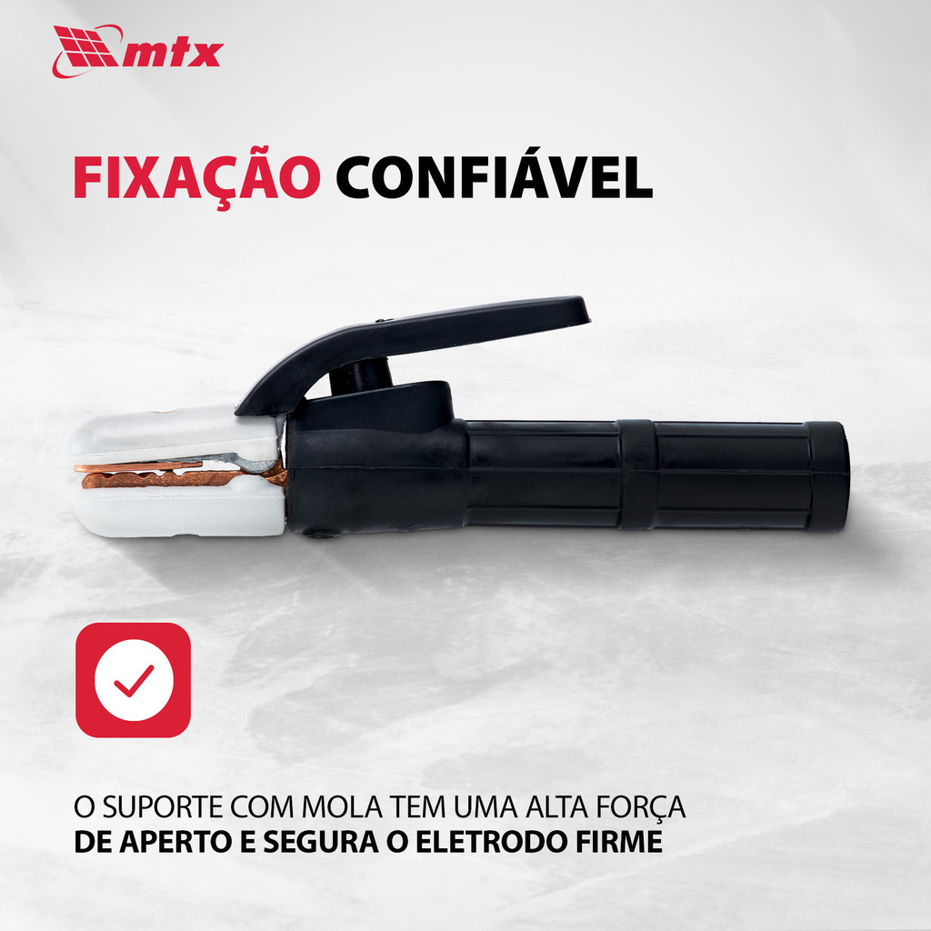 Porta Eletrodo MTX 9145355 – Alta Performance para Soldagem Profissional O Porta Eletrodo MTX 9145355 é projetado para ser compatível com máquinas de solda que operam com corrente de até 300 A. Este acessório é essencial para segurar o eletrodo na posição correta e fornecer corrente elétrica durante o processo de soldagem, garantindo um resultado preciso e eficiente. O porta eletrodo é adequado para uso com eletrodos de até 6,3 mm de diâmetro. Vantagens: Fixação Confiável: O suporte de mola possui grande força de aperto, garantindo que o eletrodo seja mantido firmemente no lugar durante o processo de soldagem. Segurança: A alça isolada é feita de plástico de alta qualidade, com propriedades de isolamento elétrico aprimoradas, proporcionando segurança adicional durante o uso. Leveza e Conforto: Com um peso de apenas 240 g, o porta eletrodo MTX 9145355 oferece conforto durante o uso prolongado, evitando fadiga e aumentando a eficiência do trabalho. Ideal para soldadores profissionais e amadores, o Porta Eletrodo MTX 9145355 proporciona a estabilidade e controle necessários para trabalhos de soldagem com máquinas de até 300 A.