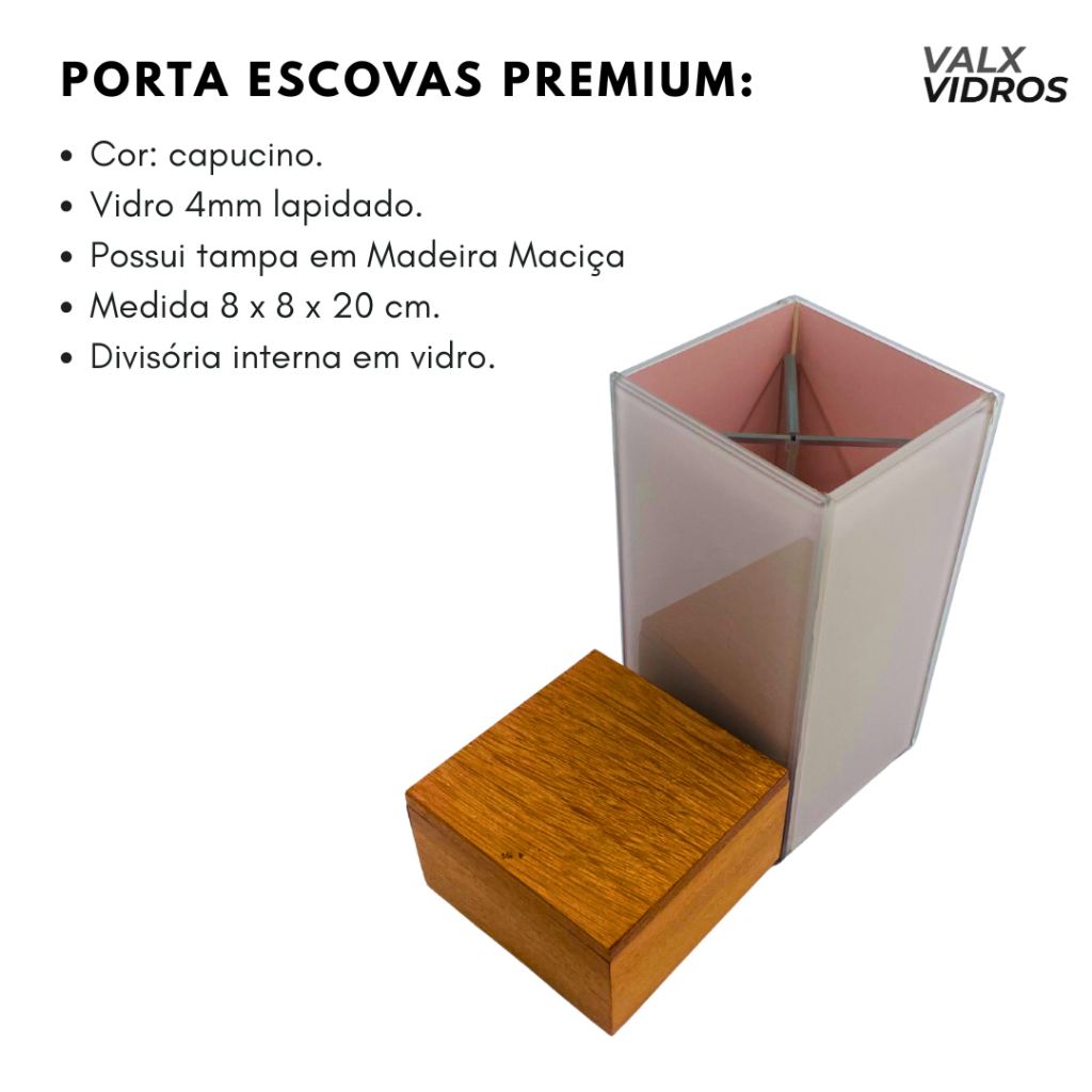 Porta Escova Premium em Vidro com Tampa de Madeira – Design Moderno e Funcional | VALX Vidros Decoração Transforme a organização do seu banheiro com elegância e praticidade! O Porta Escova Premium da VALX Vidros Decoração é a escolha ideal para quem busca estilo, durabilidade e higiene no dia a dia. ✅ Produzido em vidro de alta qualidade, oferece resistência e um visual sofisticado ✅ Tampa em madeira maciça, com acabamento impecável e toque natural ✅ Divisória interna removível, facilitando a limpeza e adaptando-se às suas necessidades ✅ Capacidade para 2 escovas de dentes e 1 creme dental ✅ Disponível em cores neutras e modernas, que combinam com qualquer decoração ✅ A combinação da transparência do vidro com o charme da madeira traz um toque exuberante e contemporâneo ao ambiente ✅ Medidas: 8x8x22 cm – ideal para ocupar pouco espaço com muito estilo ✅ Embalagem caprichada, garantindo segurança e ótima apresentação para presente ou revenda Ideal para banheiros elegantes, lavabos minimalistas ou como presente refinado. Garanta já o seu e leve mais beleza e organização para sua rotina com a qualidade da VALX Vidros Decoração!