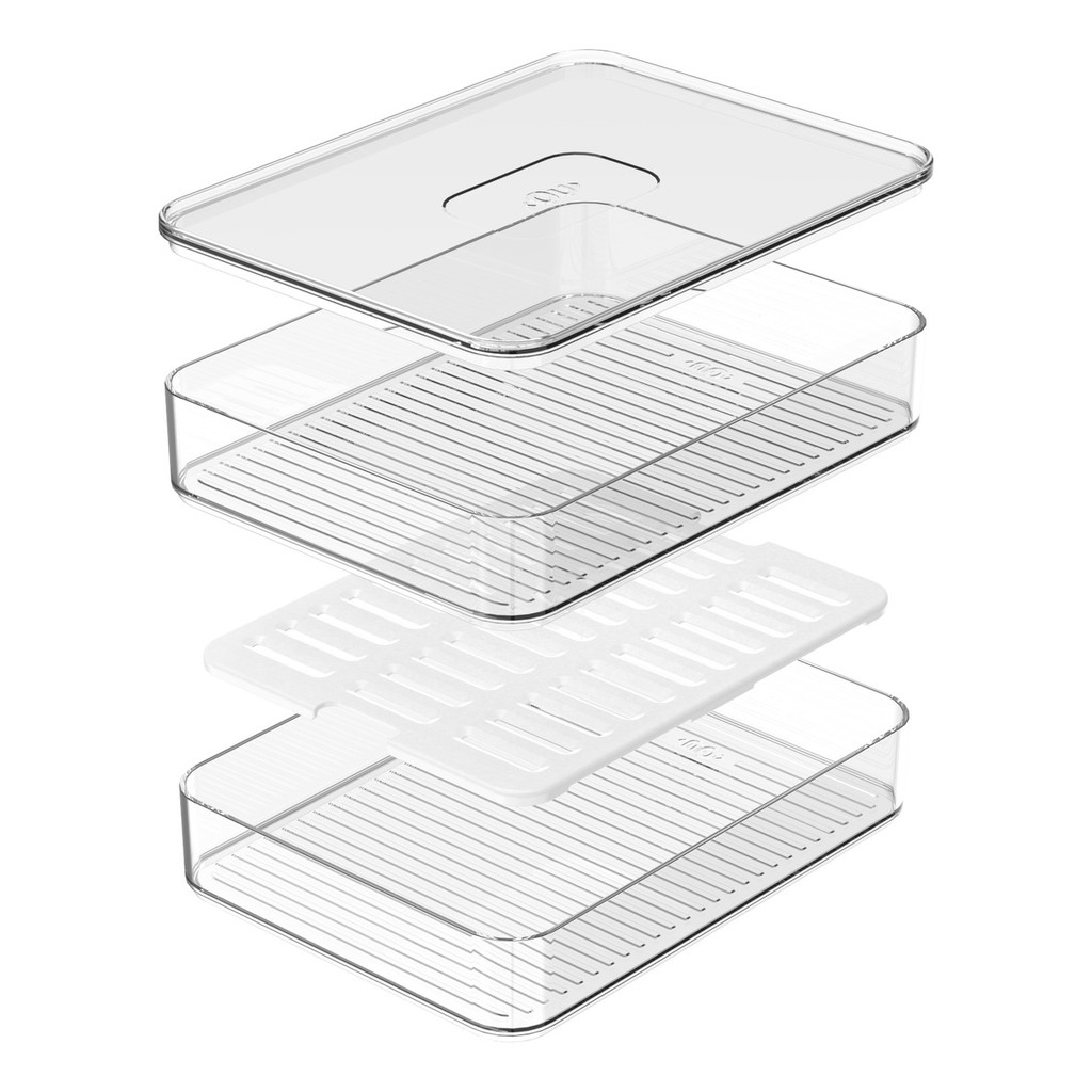 O Porta Frios Duplo Clear Fresh é o novo padrão de transparência para quem procura acondicionar e servir frios de forma simples e prática, promovendo beleza e funcionalidade para o dia a dia e ocasiões especiais. Empilhe, encaixe e enxergue facilmente os frios armazenados, mantendo tudo em ordem. Com design minimalista, ele combina com todos os tipos de cozinha, trazendo harmonização entre cor e transparência para facilitar a visualização dos itens sobre a mesa. Outro diferencial da linha está na sua superfície interna que possui uma grade e ranhuras, além de uma base removível que evitam o contato dos frios diretamente na superfície do produto. Super transparência, beleza e cuidado com o alimento são características da linha Clear Fresh, perfeitas para auxiliar na organização da sua geladeira e facilitar o seu dia a dia. Informações Técnicas Altura: 9,5 cm Largura: 15 cm Comprimento: 20 cm Peso: 0.35 kg Material: PS (Poliestireno) + PP (Polipropileno) Linha: Clear Fresh Instruções de Uso Não levar ao micro-ondas Não levar ao micro-ondas Não levar ao freezer Não levar ao freezer Não levar à lava-louças Não levar à lava-louças Este produto é BPA Free, não deve ser levado ao freezer, lava louças e ao microondas. Sugere-se higienizar o mesmo com sabão neutro e esponja macia, evitando produtos abrasivos no processo de limpeza.