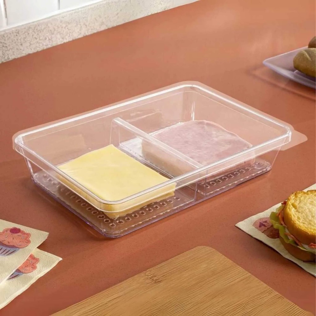 Porta Frios com Divisória – Praticidade, Organização e Elegância na Sua Geladeira! O Porta Frios com Divisória é a solução ideal para armazenar e organizar alimentos refrigerados como queijos, frios, frutas, legumes e muito mais. Produzido em polipropileno resistente, ele oferece alta durabilidade, fácil limpeza e um design moderno que combina com qualquer cozinha. Principais Benefícios: - Divisórias Removíveis: Permite separar diferentes tipos de alimentos, evitando mistura de sabores e garantindo mais frescor e higiene no armazenamento. - Apresentação Impecável: Além de funcional, o porta frios é perfeito para servir alimentos de forma organizada e charmosa, valorizando qualquer refeição ou mesa de petiscos. Tenha mais praticidade no dia a dia com um produto que une funcionalidade, beleza e eficiência! Especificações: Medidas: 27cm X 18cm (Comprimento X Largura) Cor: Transparente Material: Polipropileno Divisórias: 2 Características: - Marca:UZ Utilidades - Modelo:UZ428-TR *Imagens Meramente Ilustrativas* Conteúdo da Embalagem: - 01x Porta Frios Com Tampa 2 Divisórias Removível Design Moderno