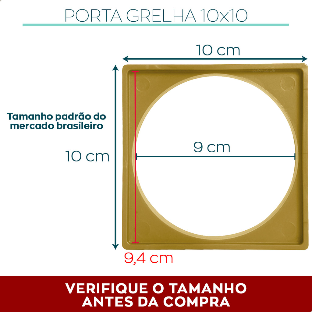 Dona D.cor é a sua loja online de acessórios para sua casa. Trabalhamos com artigos de decoração, hidráulicos e tudo aquilo que possa deixar seu lar mais sofisticado, aconchegante e inovador. Prezamos por qualidade e ótimo atendimento, para que nossos clientes se sintam satisfeitos e felizes com seus produtos Dona D.cor! Temos a PRONTA ENTREGA ÓTIMO CUSTO-BENEFÍCIO NÃO É PINTADO – Feito em ABS virgem dourado NÃO DESCASCA E NÃO ENFERRUJA. IDEAL PARA CAIXA SIFONADA E CANO PROLONGADOR DE 100mm ENCAIXADO DIRETO NA CAIXA SIFONADA – Produto fixado no chão O caixilho 10x10 cm Dona D.Cor é fabricado em ABS de alta qualidade e funciona como uma moldura para o seu ralo deixando o ambiente mais bonito e harmonizado. Este produto necessita de obras para sua instalação, é conectado diretamente na caixa sifonada ou prolongador e fixado no chão. Serve para qualquer ralo com padrão nacional de mercado. Qualidade premium e material resistente. Marca: Dona D.cor Material: ABS Cor: Dourado Garantia de fábrica: 2 anos Quantidade: 1 peça. DIMENSÕES: - Tamanho interno (encaixe do ralo): 10 x 10 cm (dimensão real 9,4 x 9,4 cm) – Tamanho padrão do mercado brasileiro - Tamanho externo: 10 cm x 10 cm - Diâmetro da abertura: 9 cm INSTALAÇÃO: - É necessário obra - Compatível com caixa sifonada e cano prolongador de 100mm – 10cm - Produto fixado no chão - Para ralos 10 x 10 (Tamanho padrão do mercado brasileiro 9,4 cm x 9,4 cm) *Não acompanha caixa sifonada (foto ilustrativa) IMPORTANTE: - Garantia de fábrica: Oferecemos garantia de 2 anos contra defeitos de fabricação ou avarias no transporte, válida em todo o Brasil. A garantia não cobre: mau uso, instalação inadequada, modificações no produto, danos por materiais abrasivos, quedas, desgaste natural, condições ambientais agressivas (como alta salinidade), falta de limpeza periódica, uso fora das especificações ou em locais com água imprópria. Não haverá indenização ou ressarcimento pelos prejuízos causados pelo defeito no produto. A nota fiscal é necessária para acionar a garantia. CUIDE DE SEU PRODUTO Limpeza: Evite materiais abrasivos, como esponjas ásperas, palhas de aço e escovas duras. Não use produtos com soda cáustica, amônia, cloro ou solventes. Para maior durabilidade, faça limpeza periódica ao menos uma vez por mês. Obs.: Produto pode apresentar variação de cor nas fotos dependendo do nível de qualidade e brilho da tela. Produto de design sofisticado e funcional, que oferece um acabamento elegante e prático para sua casa. Para mais modelos ou dúvidas, entre em contato pelo campo de perguntas abaixo.