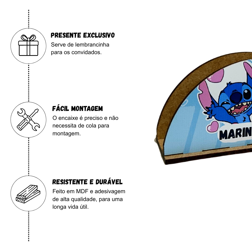 Kit Porta Guardanapo Para Festa Em MDF Personalizado, Adesivado, Tema Stitch, Vários Temas, Festa Infantil • Após a compra, por favor nos enviar o nome para personalização • Escolha a quantidade e a estampa desejada no ato da compra • Tema: Stitch • Kit com 6, 12, 18, 24 unidades CARACTERÍSTICAS DO PRODUTO: • Material: MDF de 3mm • Estampa: 2 modelos disponíveis • Adesivagem: Impressão de alta qualidade tipo brilhante • Corte a laser de alta precisão, garantindo encaixe perfeito das peças BENEFÍCIOS DO PRODUTO • Excelente porta guardanapos para festas. Além disso, serve como lembrancinha. • Porta guardanapos feito em MDF de alta qualidade, garantindo durabilidade. • Não necessita cola para montagem • Impressão de altíssima qualidade garantindo nitidez da imagem • Os guardanapos nas imagens são ilustrativas, portanto não acompanham o produto PERGUNTAS FREQUENTES: • QUANTO TEMPO PARA EU RECEBER O PRODUTO EM MINHA CASA? Na hora da compra, aparecerá para você a data prevista de entrega. Normalmente a entrega da Shopee costuma ser bem rápida, chegando até antes da data prevista. • QUANTO TEMPO DE PRODUÇÃO PARA FAZER O ENVIO (POSTAGEM)? Nossos produtos contam com estoque, então nosso envio é imediato! Comprou, fazemos a postagem no mesmo dia ou no próximo dia útil. • POSSO FAZER NOME COMPOSTO? Sim! Fazemos nome e sobrenome caso deseje. • POSSO COLOCAR A IDADE? Sim! Pode colocar o primeiro nome e a idade juntos. >>>>>>>>> ATENÇÃO <<<<<<<<< Somos fabricantes de produtos personalizados, mas o nosso envio é imediato! Para garantir o cumprimento do prazo de envio estabelecido pela plataforma e uma logística eficiente, pedimos que nos envie as informações de personalização já no ato da compra. Pode ser via observação de compra ou via chat. Caso o comprador não enviar as informações a tempo, o produto será enviado sem personalização. Caso haja outras dúvidas, nos contate pelo chat. Teremos o maior prazer em atendê-los! O IMPÉRIO DO MDF