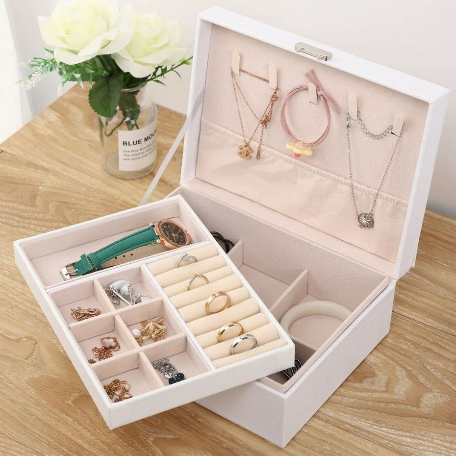 Porta Joia Dupla Camada Multifuncional Couro com Chave