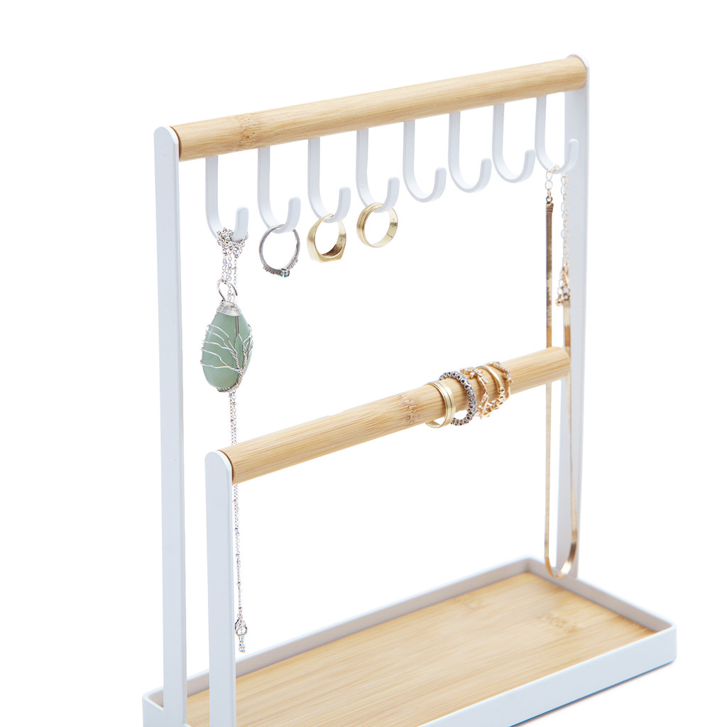 Esse é o porta-joias de bambu e metal da OIKOS. Mais organização: ótimo pra organizar colares, pulseiras, anéis e outros acessórios. ideal pra manter todos os seus acessórios em um só lugar. com os itens sempre à vista, fica mais fácil encontrar aquele colar na hora de se arrumar ;) Multiuso: não é só de acessórios que vive esse produto! ele também é bacana para armazenar objetos menores como clips, chaves, moedas e muito mais. Versátil: pode ser colocado na bancada do banheiro, no quarto, no closet e muito mais. você que manda! Com ganchos: ótimos para pendurar colares, pulseiras e deixá-los bem separados. Barra de bambu: serve como suporte para anéis, mas também pode ser utilizado para pendurar pulseiras, pequenos colares, argolas e outros. Base de bambu: amplo espaço para guardar vários outros acessórios. Design decorativo: além de funcional, ele é um lindo item de decoração. o tom natural do bambu combinado com o metal branco traz mais leveza e bossa para o ambiente. Bambu e metal: combinação super resistente e tendência na decoração. Dimensões do Produto: Altura: 27Cm Comprimento: 22cm
