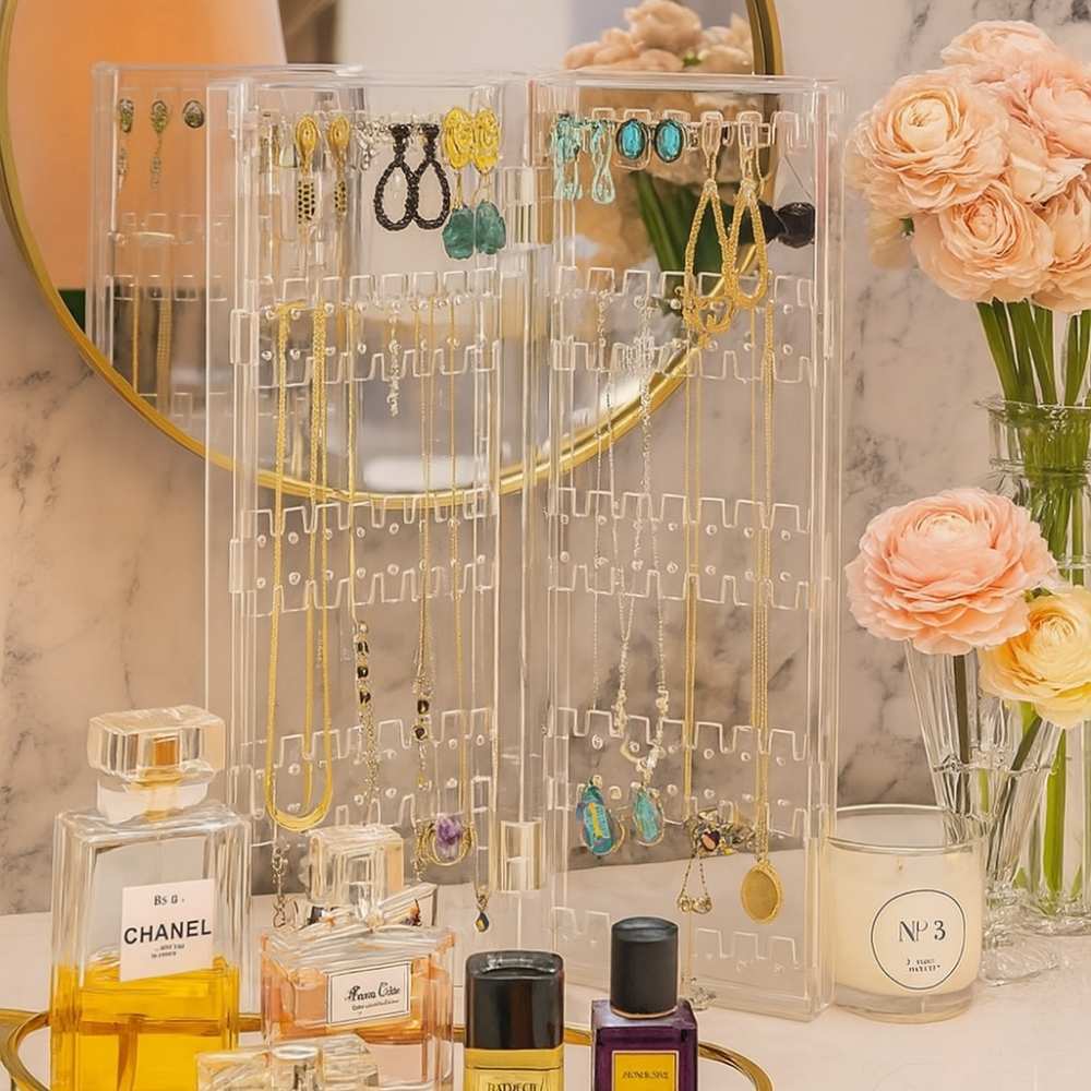 Este porta joias em acrílico chegou para completar o que faltava em sua bancada! Portátil, prático e com ótimo espaço interno, ele organiza colares, pulseiras, brincos. Tudo pendurável pela parte de dentro da peça. Fabricado em acrílico transparente, o porta joias também pode ser levado para diversos lugares, pois seu tamanho permite que seja carregado facilmente em bolsas de mão ou em mala de viagem. Não deixe de adquirir um para chamar de seu! Características: Organiza diversas peças Ganchos internos Design moderno Acrílico de alta resistência Dados técnicos: Largura fechado: 10,5cm Largura aberto: 21,5cm Altura: 28cm Profundidade: 2cm