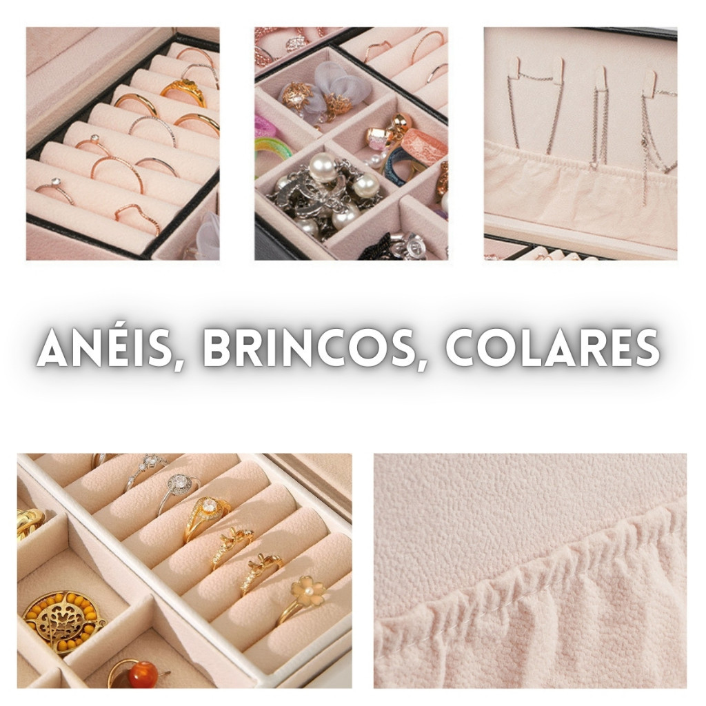 Porta Joias Grande Duplo Caixa Colar Bijuteria Portatil Aneis Pulseira com Chave Luxo