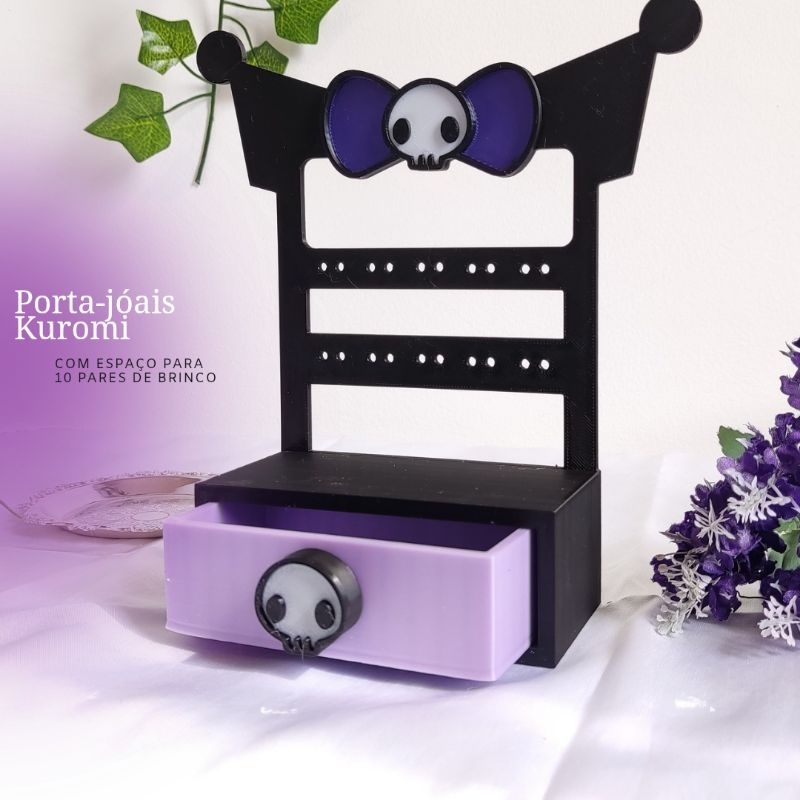 Porta-jóias da kuromi com espaço pra brinco e gavetinha para outros acessórios -Materiais: 100% PLA biodegradável -Medidas: 18,5cm x 11cm profundidade 6cm -Produção própria, fabricado em nosso ateliê com muito carinho! -Cor: Preto e lilás **AVISO: atente-se às altas temperaturas. O produto é fabricado em PLA, um tipo de termoplástico que é sensível ao calor. Não deixe-o em contato direto com o sol ou com alguma superfície que esteja extremamente quente. Imagens reais do produto. Item de pré-encomenda - produzimos e enviamos num período de 2 a 7 dias úteis.