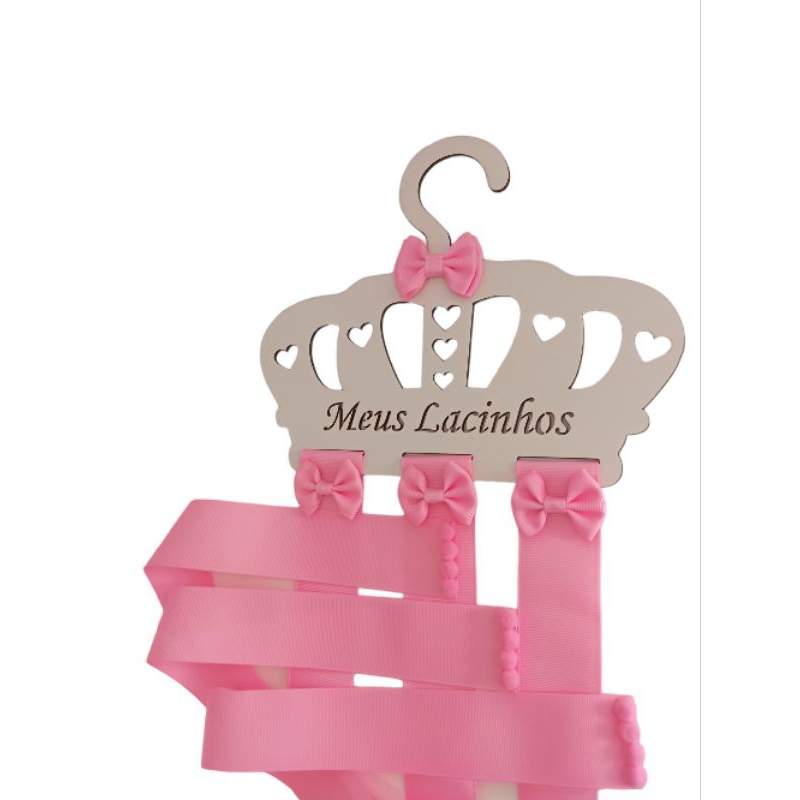 Porta laços meus lacinhos Tem mamãe aí que precisa organizar os lacinhos da Princesa??? Além de útil para armazenar os acessórios da sua princesa, também é uma peça totalmente decorativa e apaixonante, cada detalhe foi pensando com muito carinho. A ideia é deixar todos os lacinhos a vista, arrumadinhos e visíveis para facilitar a escolha na hora de arrasar no look. Peça em MDF 3mm , tam 20 x 24 cm cortada em formato de Coroa e escrita a laser, com fitas com 60 cm .Cabem 10 a 12 laços grandes , ou 15 a 18 médios ou 20 a 25 pequenos . E claro...sem laços amassados, sujos ou jogados, Um sonho de qualquer mamãe, Não é? Vem pra Mimos da Lulu